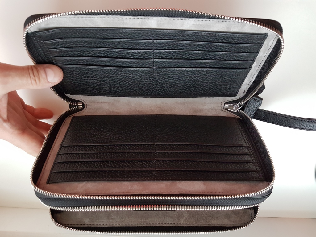 Два полноценных отделения на молнии. Внутри множество отделений под купюры, карточки, документы, чеки и так далее. Есть кармашек для мелочи, закрывающийся на молнию.