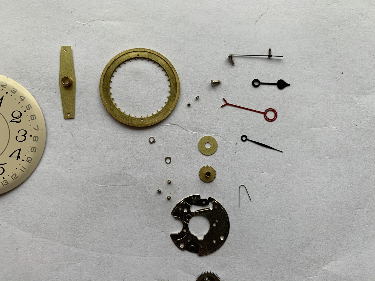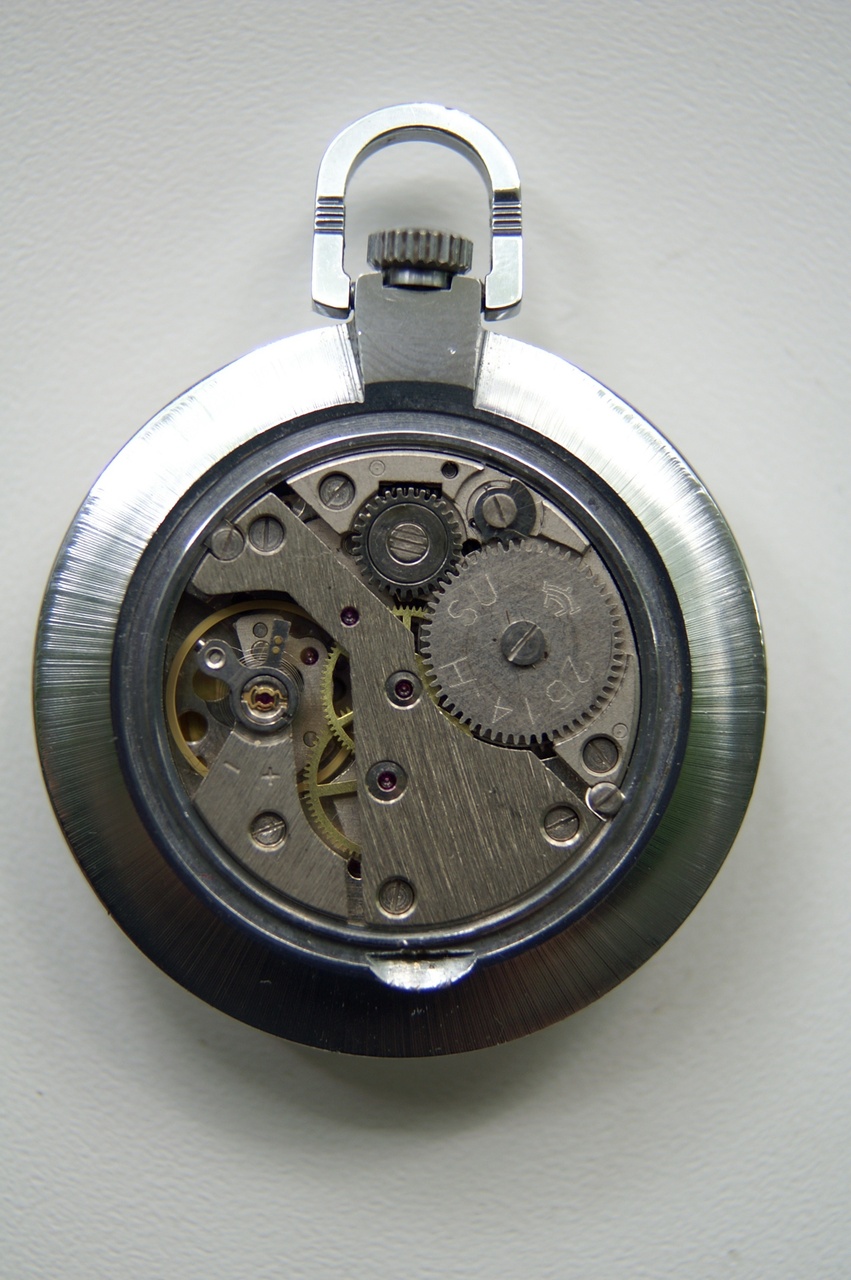 Также, помимо этого, была очень интересная разработка карманных часов Ракета со стрелочной индикацией календаря. Механизм на базе калибра «Плоская Россия» 2614.Н, позднего образца (отсутствует амортизатор под анкерное колесо, колеса анодированные). Привод осуществлен следующим образом: от числового кольца идет перемычка, закрепленная двумя винтами со втулкой под стрелку календаря.
