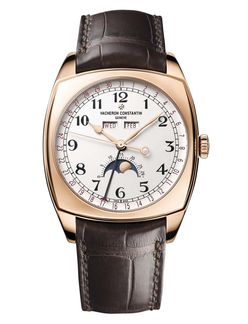 Новая модель Harmony Complete Calendar (Ref. 4000S/000R-B123) от швейцарской часовой компании Vacheron Constantin имеет полированный корпус, выполненный в подушковидной форме, изготовленный из 18-каратного розового золота, длиной 49,3 мм, шириной 40,0 мм, толщиной 11,0 мм. На торце рифленой заводной головки, расположенной на 3 часах, выгравировано изображение мальтийского креста - эмблемы бренда Vacheron Constantin. Сапфировое стекло установлено на передней стороне часового корпуса и на его завинчивающейся задней крышке. Посеребренный опаловый циферблат с черными арабскими цифрами и золотыми часовой, минутной и секундной стрелками (последняя с кольцом на противовесе). Модель оснащена новым мануфактурным швейцарским автоматическим механизмом Vacheron Constantin 2460 QC, с балансовой частотой 28800 полуколебаний в час (4 гц), 40-часовым запасом хода, функциями индикации часов, минут, секунд (посредством соответствующих центральных стрелок), даты (посредством специальной вороненой центральной стрелкой с наконечником в форме полумесяца, выполненным в бордовом цвете на соответствующей круглой шкале, размеченной бордовыми арабскими цифрами и расположенной на периферии циферблата), дня недели и месяца (посредством соответствующих буквенных указателей в прямоугольных апертурах, расположенных на 11 и 1 часах) и фаз Луны (посредством соответствующего указателя, расположенного на 6 часах и требующего корректировки один раз каждые 122 года).