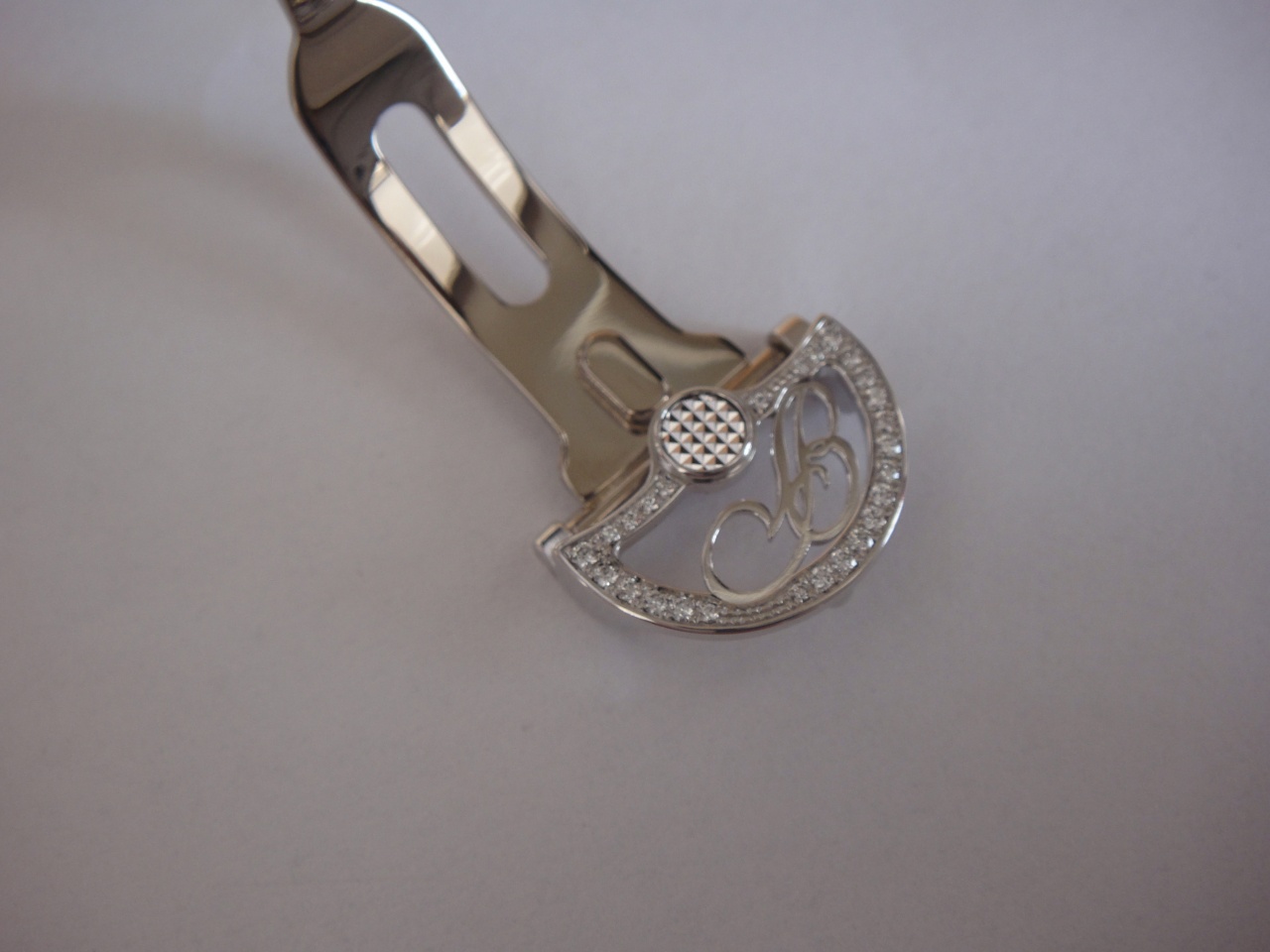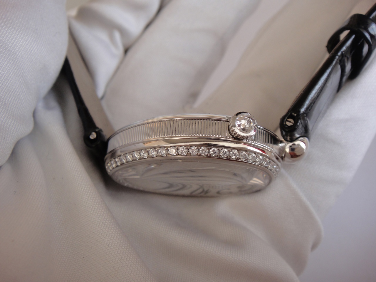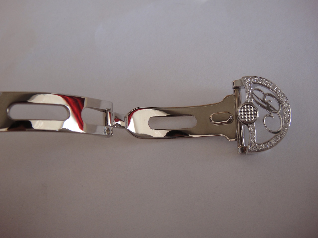 Корпус: Белое 18-каратное золото 750 пробы, из трех частей, овальной формы; инкрустирован бриллиантами, фирменная рифленая боковая поверхность Бреге "монета"; заводная головка из золота с кабошоном - положение «4 часа»; прозрачная задняя крышка . Большой чистейший бриллиант на "6 часах",раскладывающаяся застежка-клипса из золота 750 пробы.
