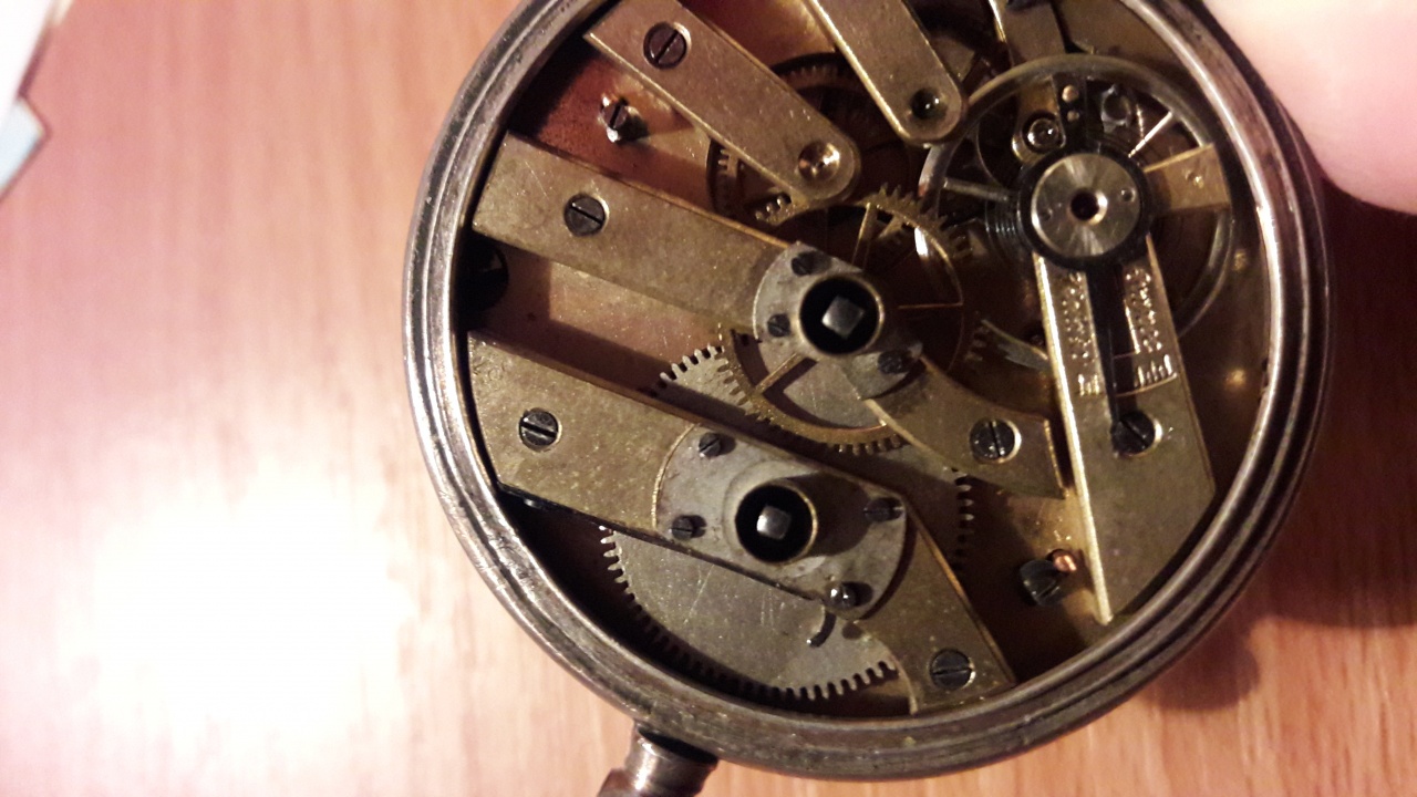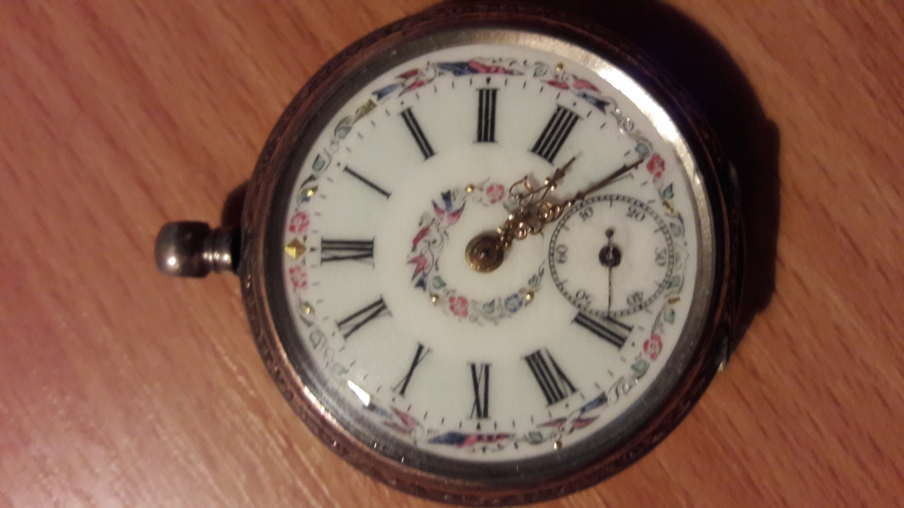 Их диаметр 4,6 см. Кроме надписи на внутренней части - цилиндр и 6 рубинов - ничего не нашла. Ни проб, ни других букв и цифр. Может быть, их основа - золото и серебро. Циферблат элегантен, на него нанесен рисунок (две ласточки), орнамент также присутствует, часть его выполнена с использованием золота (выпукло). Цифры римские. Стрелки красивые. Стрелка на маленьком циферблатике начинает двигаться, когда часы беру в руки.