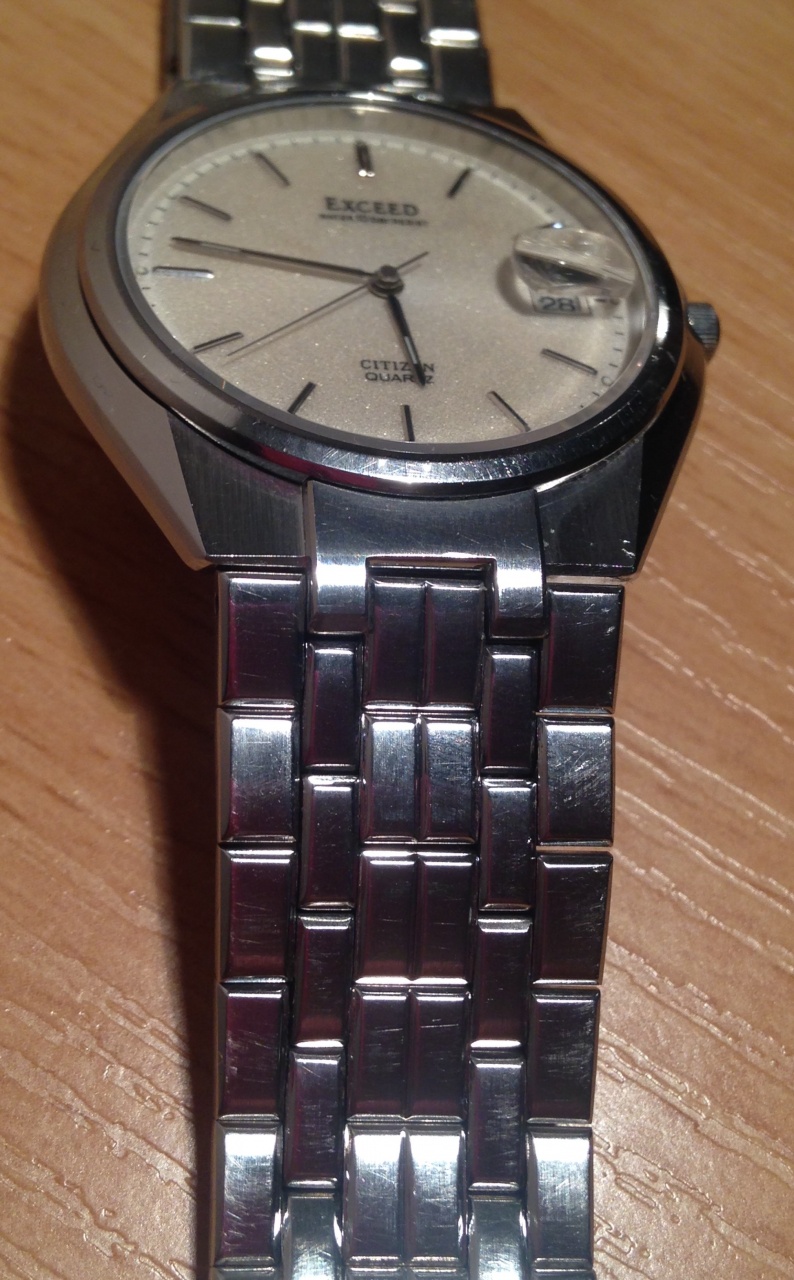 Запал на стекло с линзой и удивился тому, что Exceed на циферблате стоит выше слова Citizen. Несмотря на возраст, который я так и не смог определить точно - то ли 2003, то ли 1993 год, хотя я склоняюсь к последнему. Размер воплне актуальный: 35 мм без ЗГ, 6,5мм толщина и !литой! браслет у крепления имеет ширину 19 мм. При покупке не уточнял размеров и думал, что если браслет не подойдет заменю на ремешок, но как видно на фото- сделать это будет не просто. Равно как и вообще снять браслет. Судя по всему там шпильки надо вытаскивать приспособой. Интересен и замок браслета - впервые такой вижу. Но все удобно и добротно сделано. А чего стоит перламутровый циферблат молочного цвета!. Вот только секундная стрелка в метки не точно попадает, что странно для exceed.