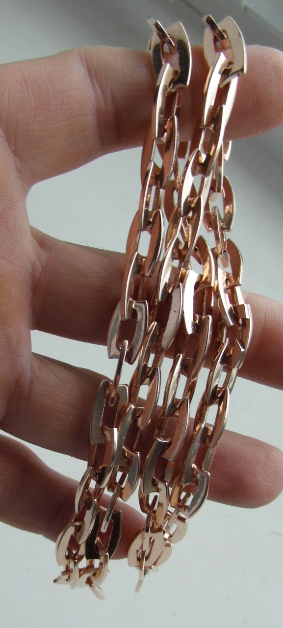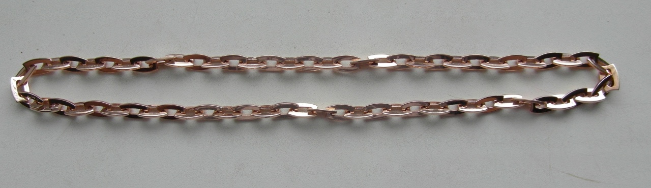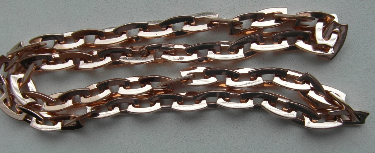 В продаже шикарная эксклюзивная золотая мужская цепочка, делалась под заказ, по индивидуальному дизайну, единственная в таком варианте и исполнении, без аналогов! Размер 60 см., параметры звеньев на фото, золото 583 пробы, вес 75.74 грамма, состояние новой, скрытый замок "краб", смотрится шикарно и богато, крупное звено, отличное отражение и блеск, все "чекухи" проставлены, 583 "зубр" Беларусь, цена 2250 долларов США!