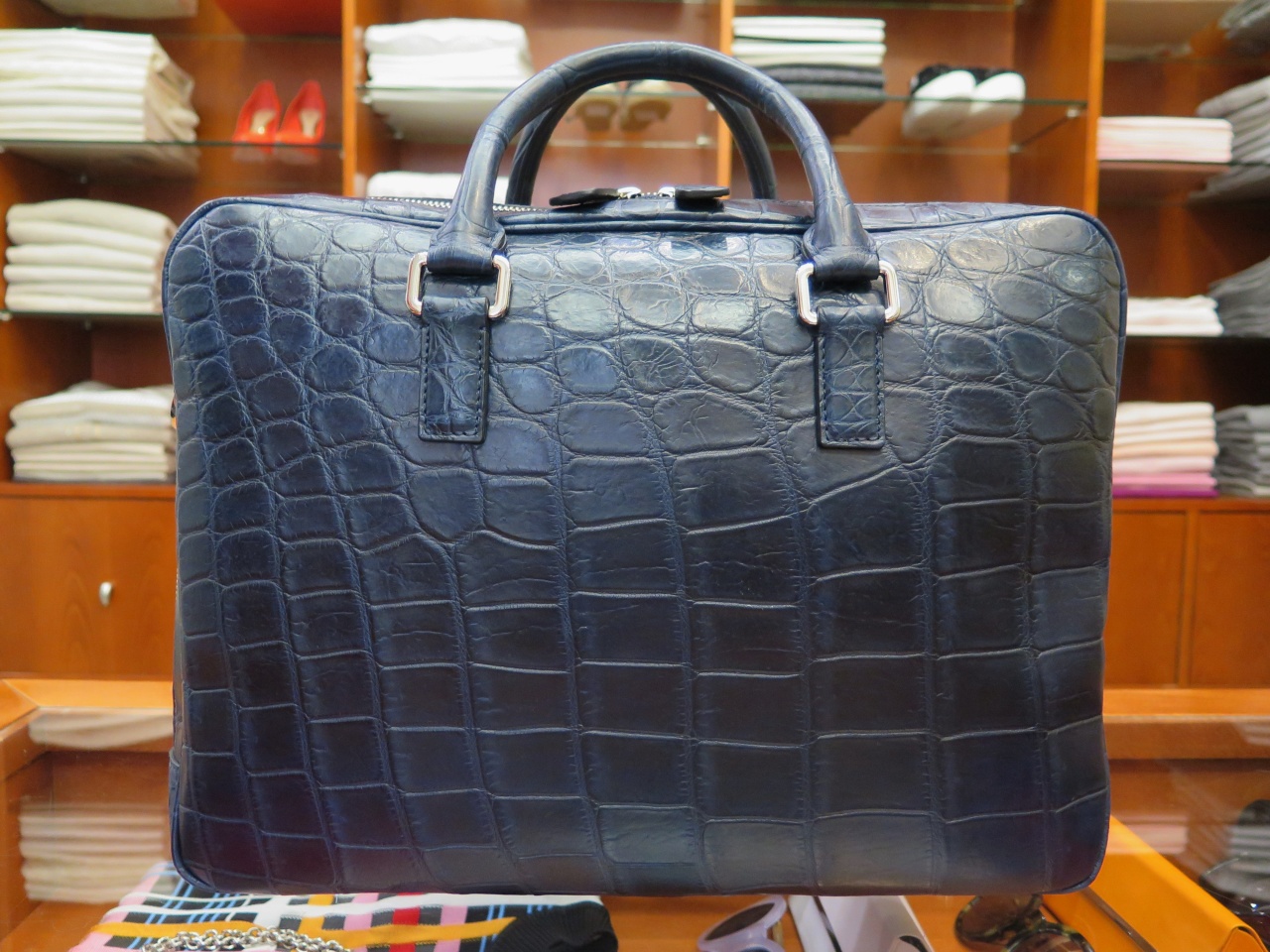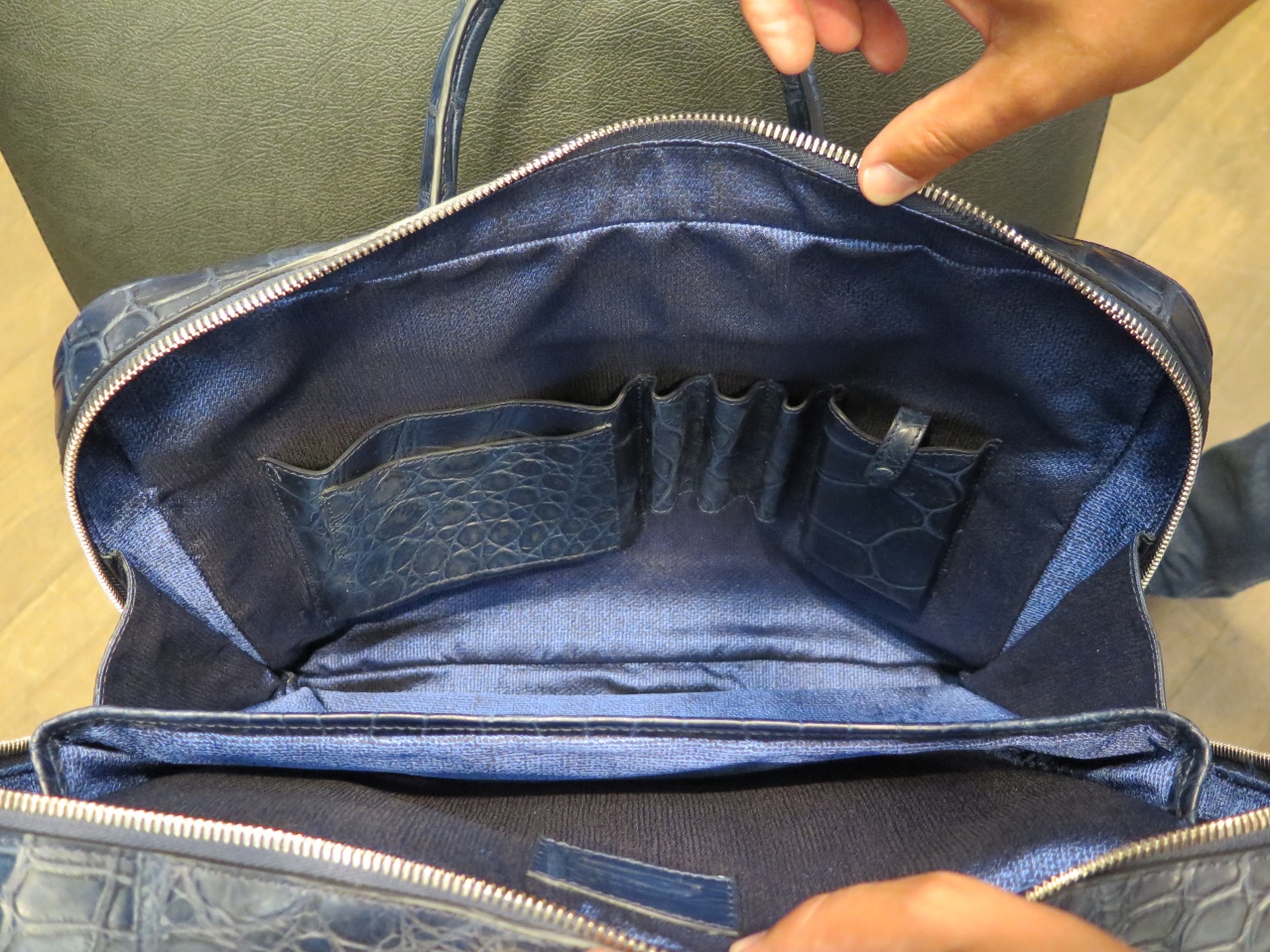 Внутри отделана красивой шёлковой тканью синего цвета. Имеются кармашки под ручки, смартфон и карточки, изготовленные из кожи аллигатора
