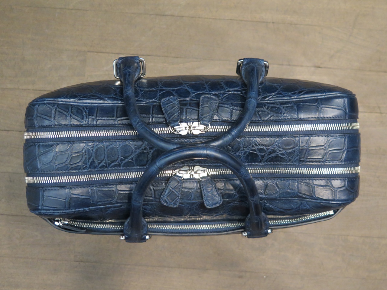 Сумка имеет несколько отделений и застегивается на две основные молнии с бегунками из кожи крокодила.