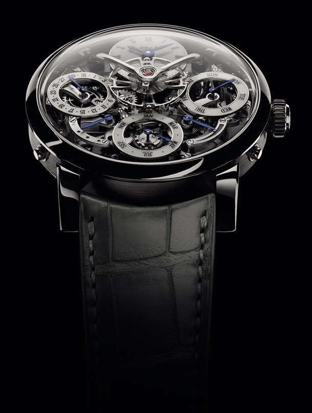 Благодаря применению новаторской системы индикации, разработанной специально для Legacy Machine Perpetual, создается ощущение, что указатели парят над механизмом без видимой опоры. На самом деле эти скелетонизированные индикаторы установлены на скрытые колонки. Такое решение было бы невозможно реализовать в традиционном механизме вечного календаря типа «grand levier» – они бы заблокировали его работу.