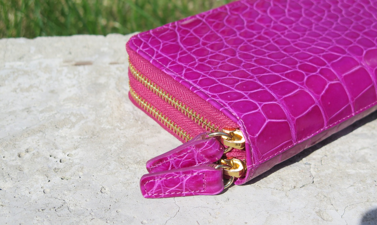 Клатч застегивается на две позолоченные молнии с бегунками из кожи крокодила и имеет три больших отделения для банкнот, отделение для ручки, 24 отделения для кредитных карт или визиток, три отделения для паспорта, водительских прав и других документов. Внутри клатч отделан телячьей кожей розового цвета. В клатч можно дополнительно положить смартфон, ключи от автомобиля и другие небольшие предметы.