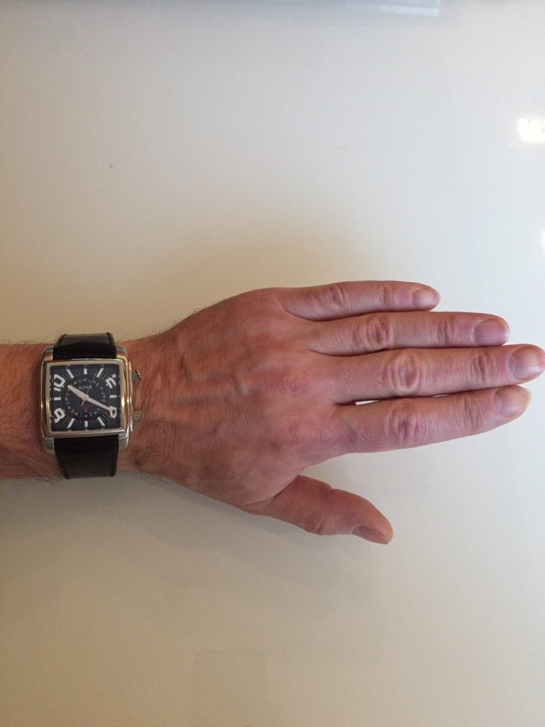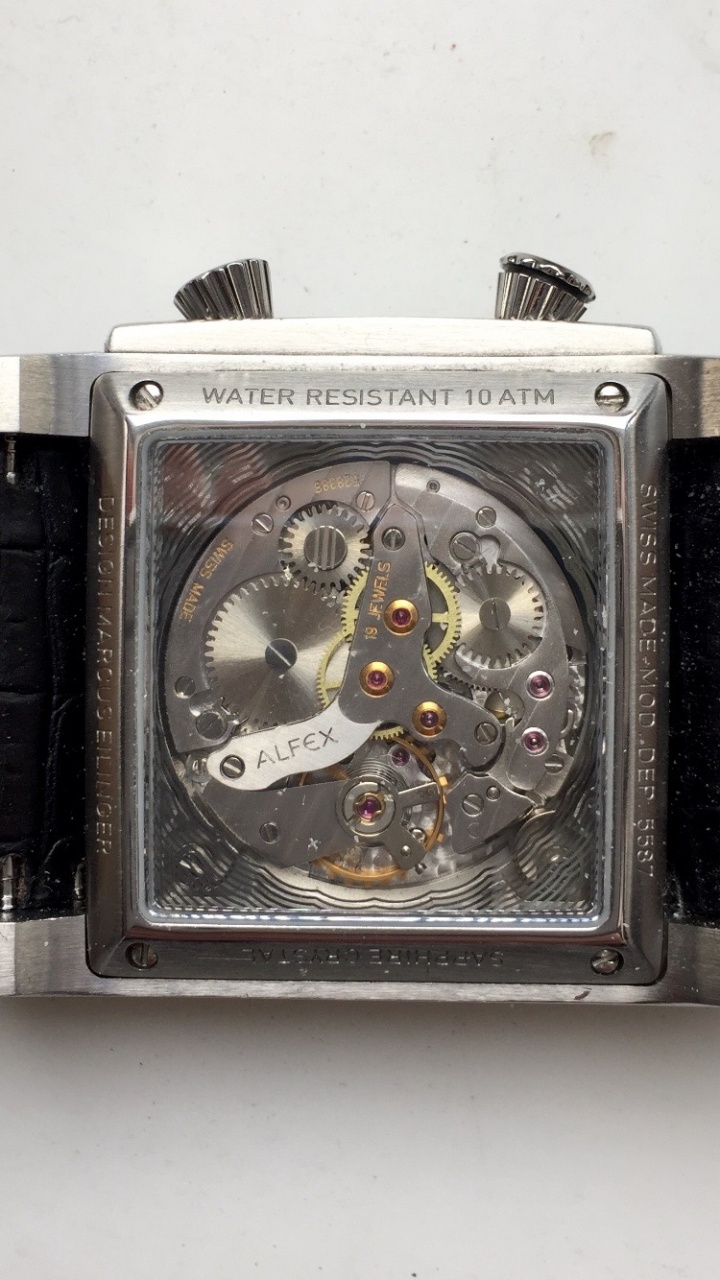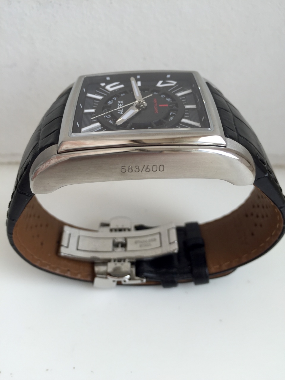 Часы мужские ALFEX. Новые в пленках, на гарантии, гарантия 2 года. Страна Швейцария. Лимитированная серия - 600 штук, № 583. Дизайнер Marcus Eilinger. Механизм 5587, запас хода 48 часов. Функции - часы, минуты, секунды, будильник. Флуорисцентные стрелки и циферблат. Корпус 40*40 мм, нержавеющая сталь. Сапфировое стекло и задняя крышка. Водонепроницаемость 10 АТМ. Ремень - кожа, раскладывающаяся застежка. Ритэйл(цена) - 78000.
