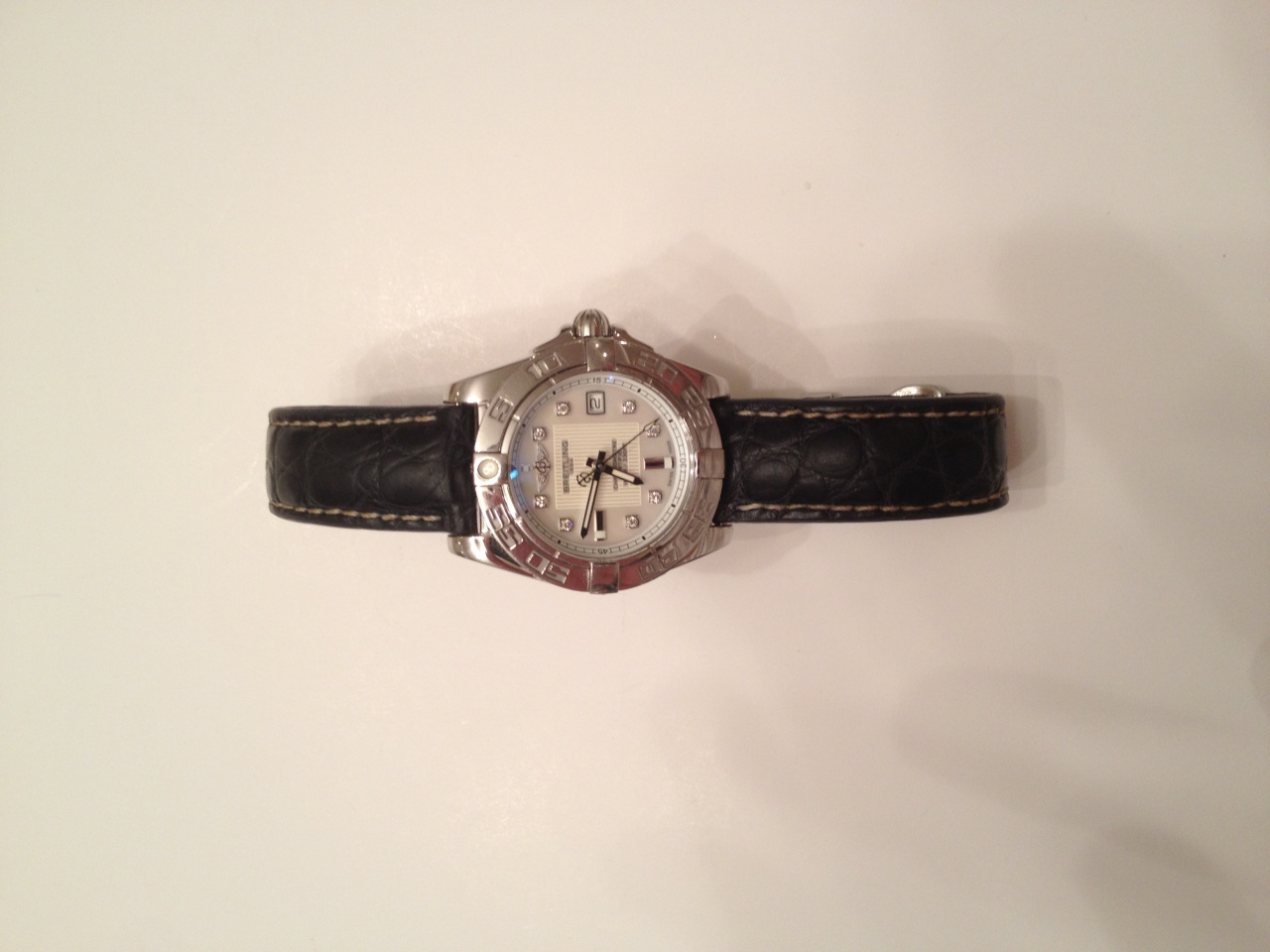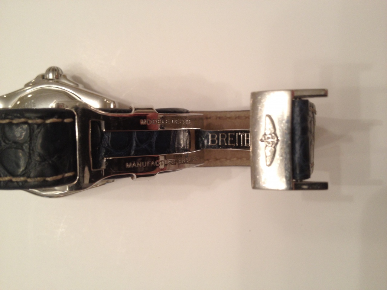 Корпус сталь. Ни разу не полировались, батарейка менялась. Циферблат украшен 8 бриллиантами. Механизм суперкварц, калибр Breitling 71. Застежка клипса. Ремень аллигатор.
