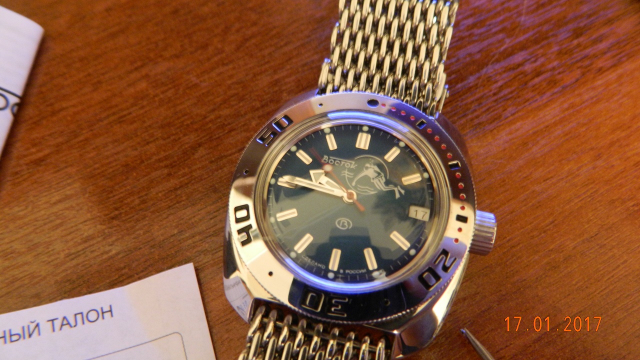 Продаю часы Восток Амфибия 710059. Состояние идеальное, маленькая царапка на задней крышке и едва заметная на стекле (но обнаружить ее не просто). Часики куплены в октябре 2016 г., полный комплект: мануал, гарантийник (гарантия до октября 2017 г.), коробка, часы, родной браслет. Носил мало и аккуратно, часы, как водится, не одни.