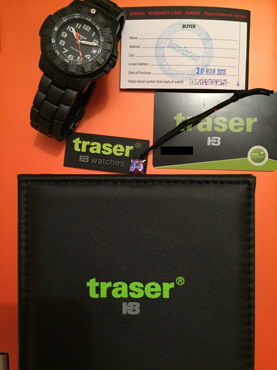 Полный комплект - собственно часы, картонная коробка, подарочная коробка из кожзама, гарантийная книжка, резиновый брелок "traser H3 watches", рекламный буклет с каталогом моделей часов Traser за 2013 год, + БОНУС (Дисконтная карта на 5% магазина часов traserh3, номер которой по понятным причинам на фото затерт)