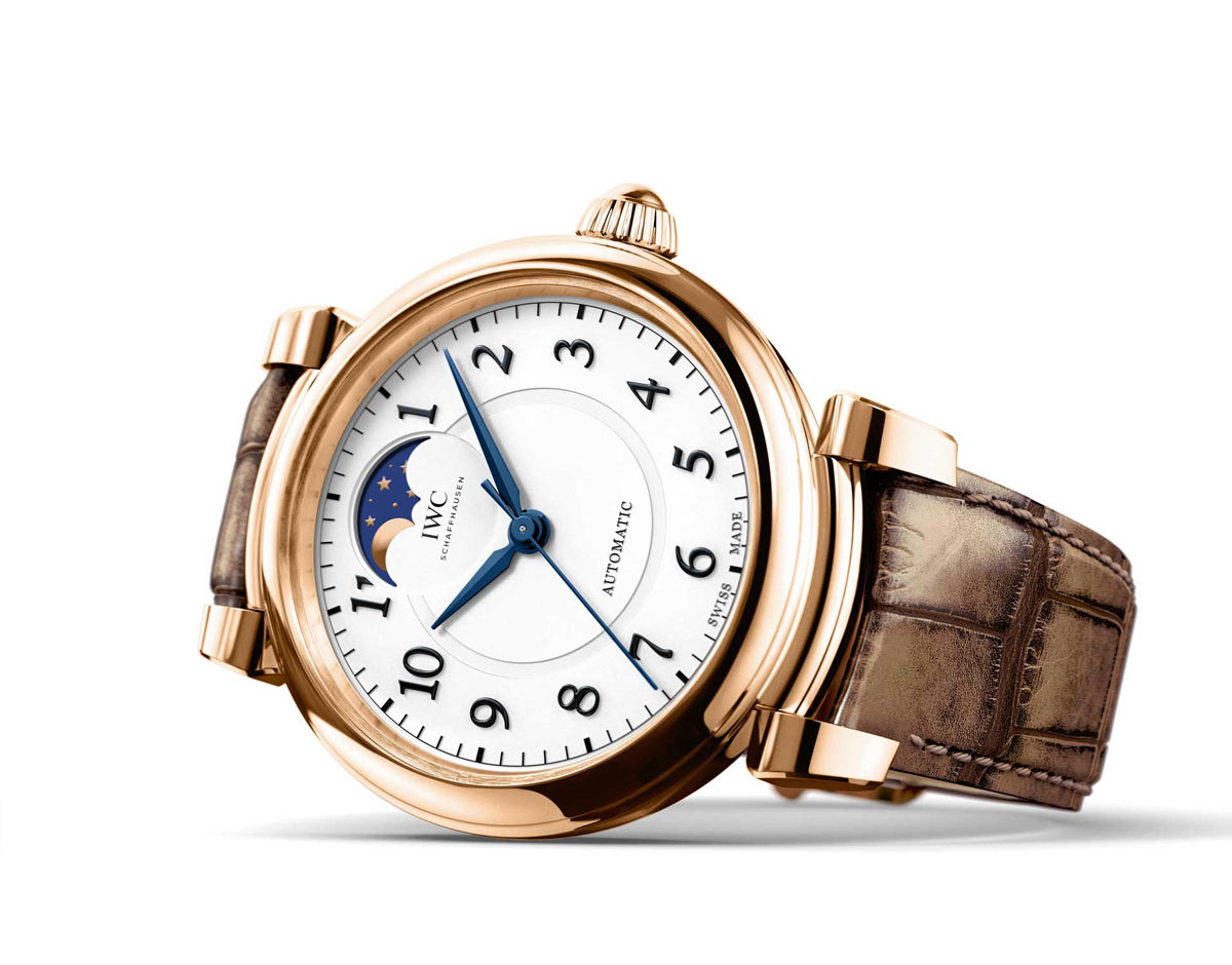 Da Vinci Automatic Moon Phase 36 (Ref. IW459308) - женские часы с круглым полированным корпусом, изготовленным из 18-каратного розового золота, диаметром 36,0 мм, водонепроницаемый до 30 метров. Рифленая заводная головка расположена на 3 часах. На завинчивающейся глухой задней крышке часового корпуса выгравировано изображение "Цветка жизни" Леонардо да Винчи. Сапфировое стекло защищает двухуровневый серебристый циферблат с черными арабскими цифрами и воронеными стрелками. Функции индикации часов, минут, секунд (посредством соответствующих центральных стрелок) и фаз Луны (посредством соответствующего указателя в фигурной апертуре, расположенной на 12 часах). Поставляется на ремешке Santoni из кожи аллигатора с застежкой из 18-каратного розового золота. Цена модели составит 14000 швейцарских франков.