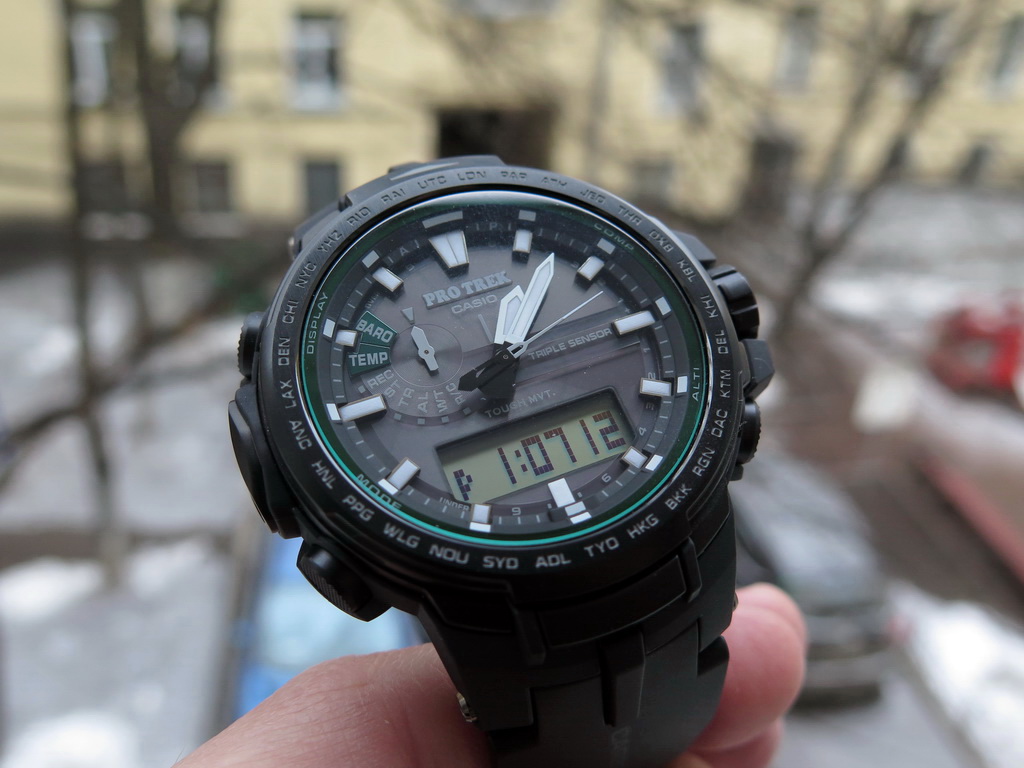 Подзарядка от солнца, Радиокоррекция времени, Мировое время, Компас, Барометр, Альтиметр, Термометр, Секундомер, Таймер, Будильник, Индикатор заряда, Режим энергосбережения, Вечный календарь, 12-24 часовой формат, Устойчивость к низким температурам до -10 ℃, Возможность отключения звука нажатия кнопок, Двойная светодиодная подсветка, Дата с днём недели, Месяц, Завинчивающаяся часовая головка, Светонакопительный состав на стрелках и метках.