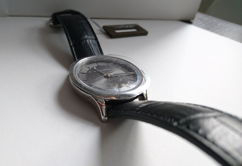 Тонкий стальной корпус с сатинированием и полировкой, ремешок из натуральной кожи. Диаметр корпуса 38 мм.