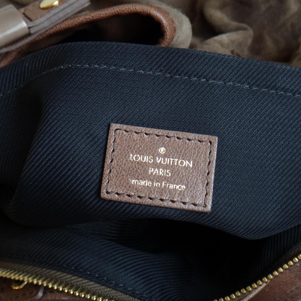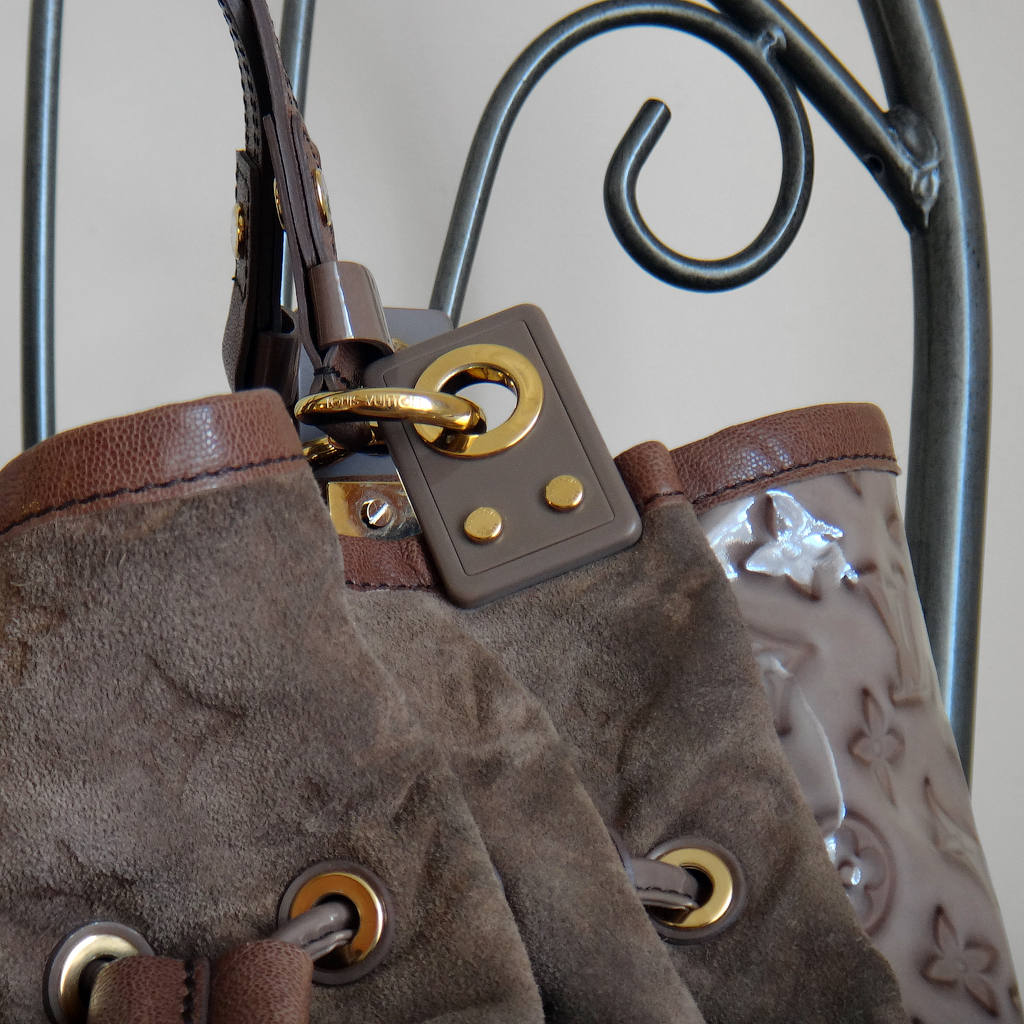 Материал сумки - коричневая замша с тиснением узора-монограммы LV, лаковая кожа также с тиснением узора-монограммы LV, ручки и элементы отделки из зернистой кожи.