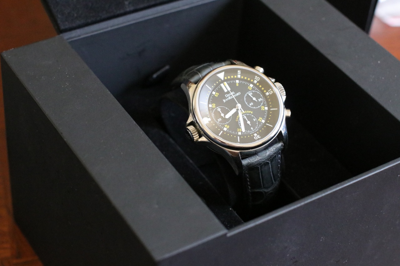 Некоторые элементы дизайна этой модели взять с Girard Perregaux WWTC Chronograph! Полный комплект документов и коробка! Великолепный красивый крокодиловый ремень серого цвета! Сохранилась пленка на задней крышке!