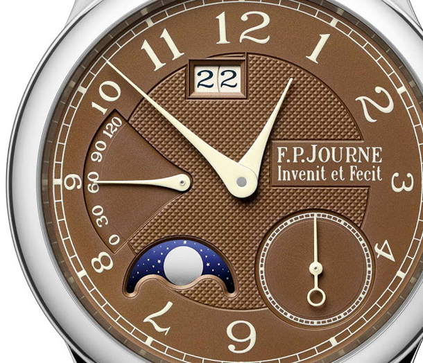 Мануфактура F.P. Journe презентовала новинку в рамках коллекции Octa Automatique Reserve, которая стала настоящим хитом среди поклонников бренда. В платиновый корпус диаметром 40 мм заключен коричневый циферблат “Havana”. Часы комплектуются ремешком из кожи аллигатора карамельного цвета с платиновой застежкой. Циферблат отделан в лучших традициях Journe – гильоширование Clous de Paris, арабские цифры и минутная шкала в виде железнодорожного полотна на периферии.