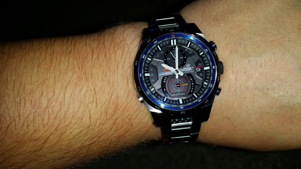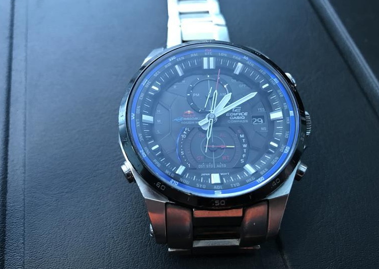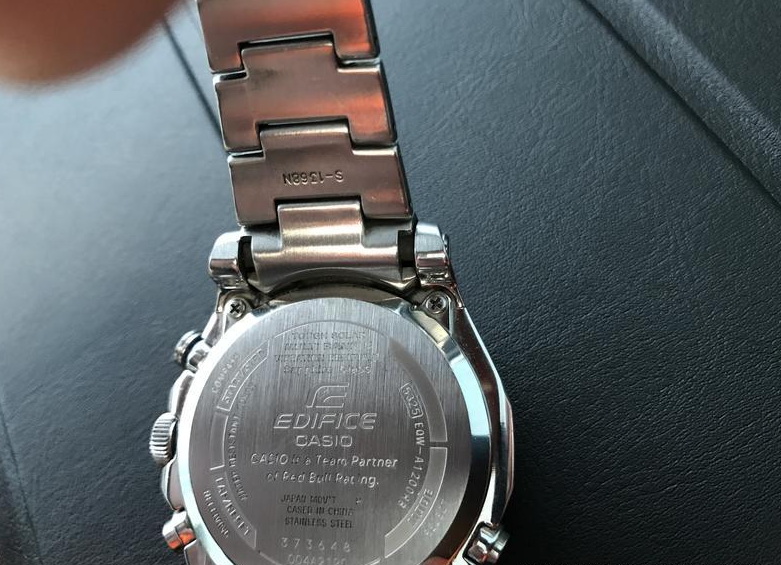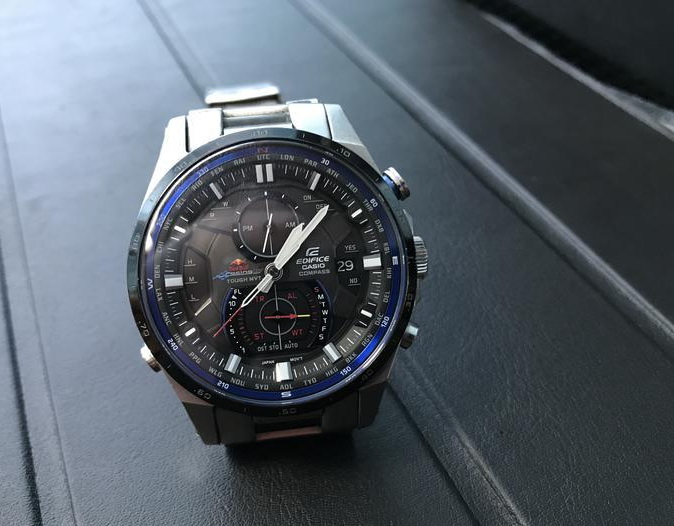 Лимитированная серия Infiniti Red Bull Racing. Питание от солнечной энергии, индикатор низкого заряда батареи. Необритовое светонакопительное покрытие обеспечивает длительное послесвечение в темноте даже после кратковременного нахождения на свету. Модуль часового механизма покрыт виброустойчивым альфа-гелем, уменьшающим вибрацию. Функция автоматического сохранения энергии. Время работы аккумулятора без подзарядки - 6 месяцев, при включенной функции сохранения энергии - 22 месяца. Коррекция текущего времени радиосигналом на территории почти всей Европы, США, Японии и Китая. Встроенный цифровой компас. Секундомер с точностью показаний 1/20 сек и временем измерения 1ч. Память на 10 этапов. Таймер обратного отсчета времени от 1мин до 1ч. Мировое время. 12-ти 24-х часовой формат времени. Звуковой сигнал - в установленное время издается тональный сигнал. Алюминевый безель. Завинчивающаяся электронная заводная головка с защитой. Задняя крышка с винтовым фиксатором. Раскладывающаяся застежка, расстегиваемая одним касанием.
