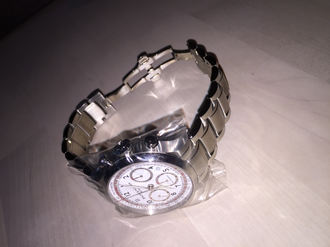 Трёхсекционный хронограф, тахиметрическая шкала, телеметрическая шкала, окошко даты между метками «4-5 часов» , прозрачная задняя крышка