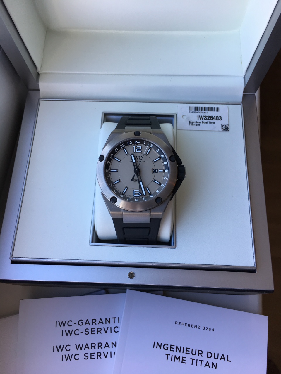 Механический часы с автоподзаводом. Запас хода - 42 часа при полном заводе. Указатель даты. Центральная секундная стрелка со стоп-функцией. Завинчивающаяся заводная головка. Плоское сапфировое стекло с двусторонним антибликовым покрытием. Черный каучуковый ремень. Диаметр корпуса 45 мм, толщина 13 мм. IWC Ingenieur Dual Time Titanium отображают время в двух часовых зонах. Время в другом поясе показывается при помощи дополнительной длинной стрелки, которая указывает на 24-часовую шкалу, нанесенную по периметру циферблата. Корпус титановый.Состояние часов идеальное, куплены летом 2016 года. Цена рекомендованная производителем 8800$. Информацию о часах можете посмотреть по ref IW326403.