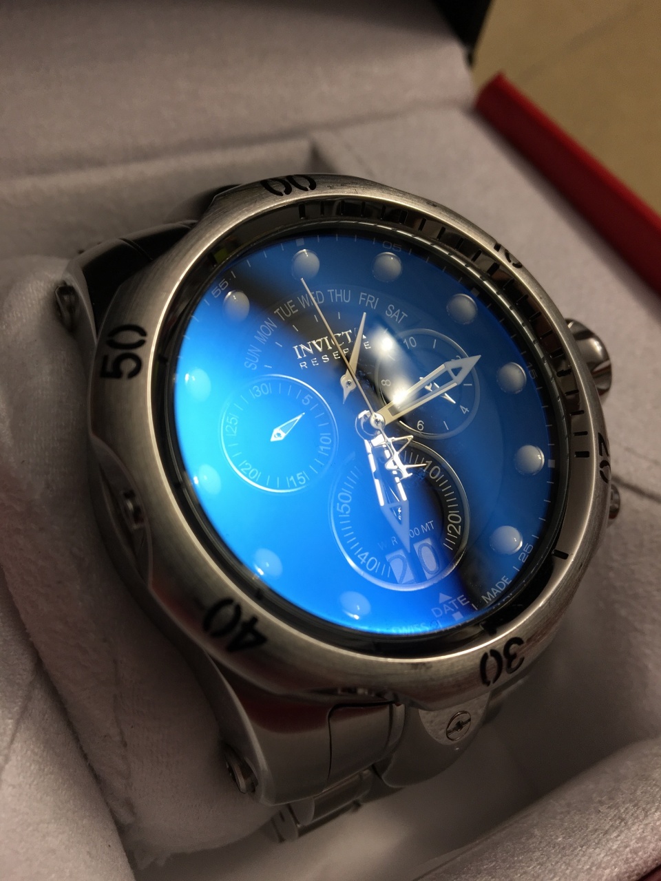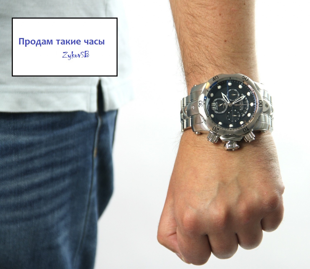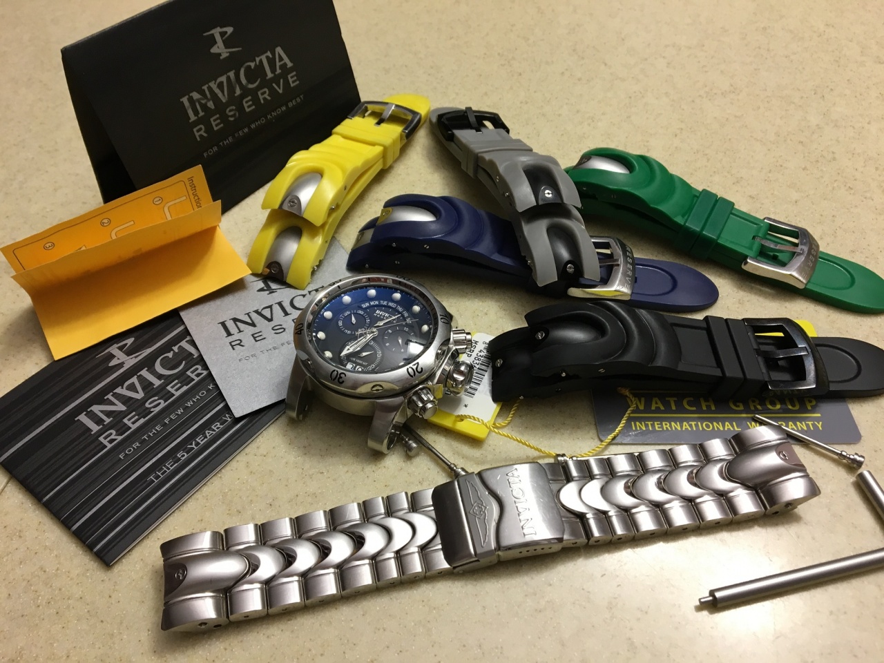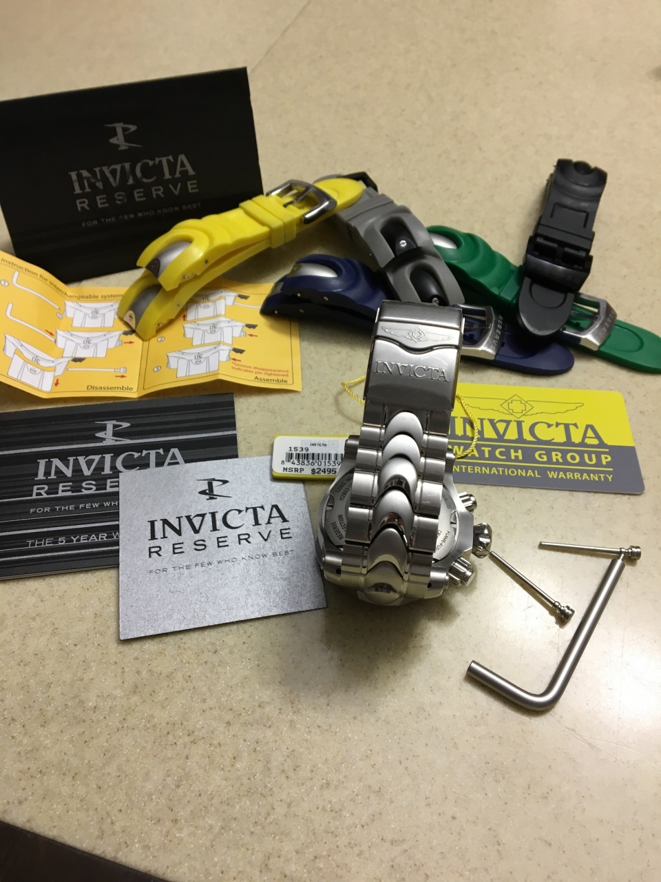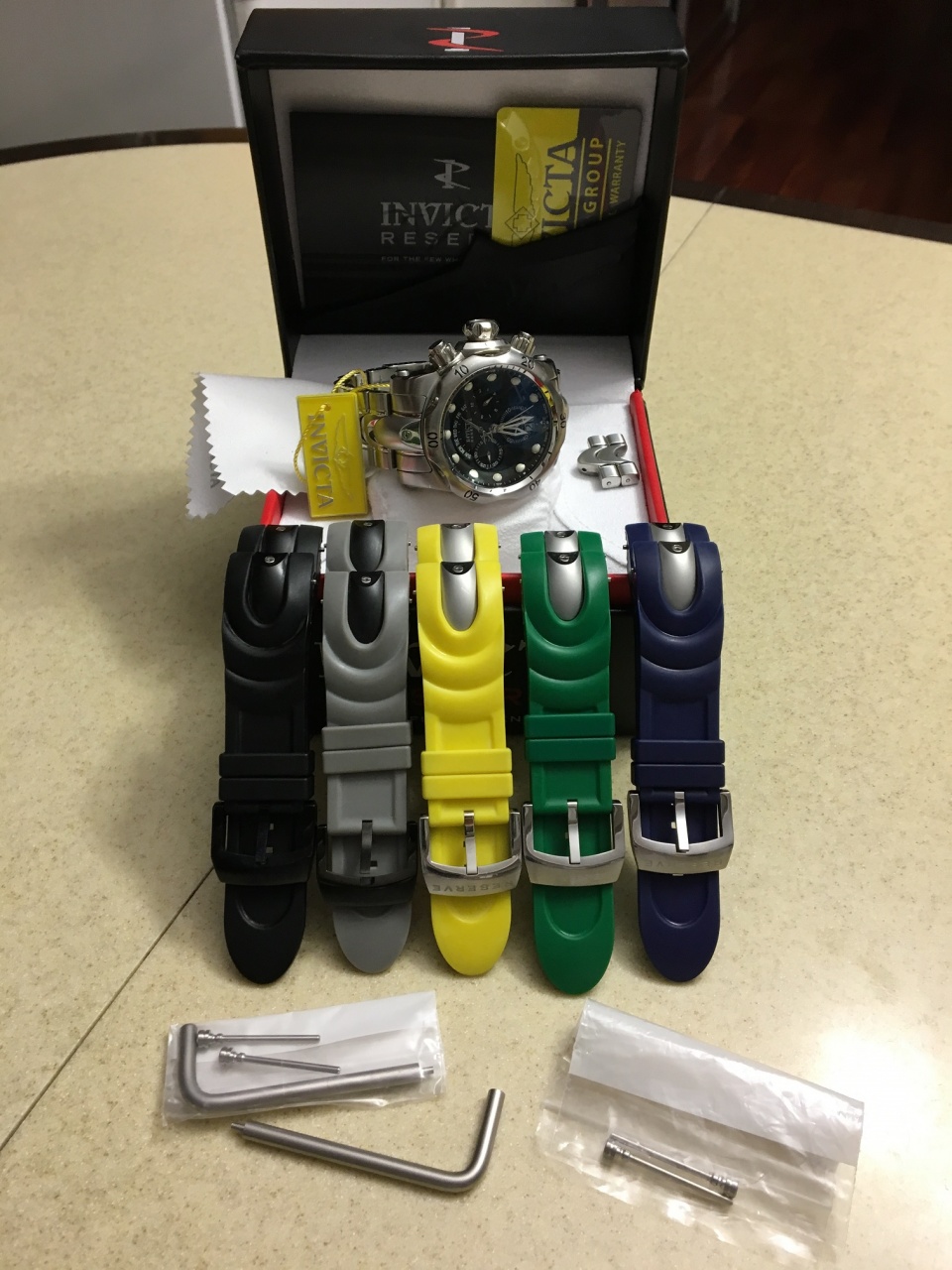 Invicta Venom Reserve 1539 на стальном браслете + ПЯТЬ сменных силиконовых ремешков (черный, серый, желтый, зеленый и синий) + ДВА набора запасных шпилек и ключей для ремешков/браслета.