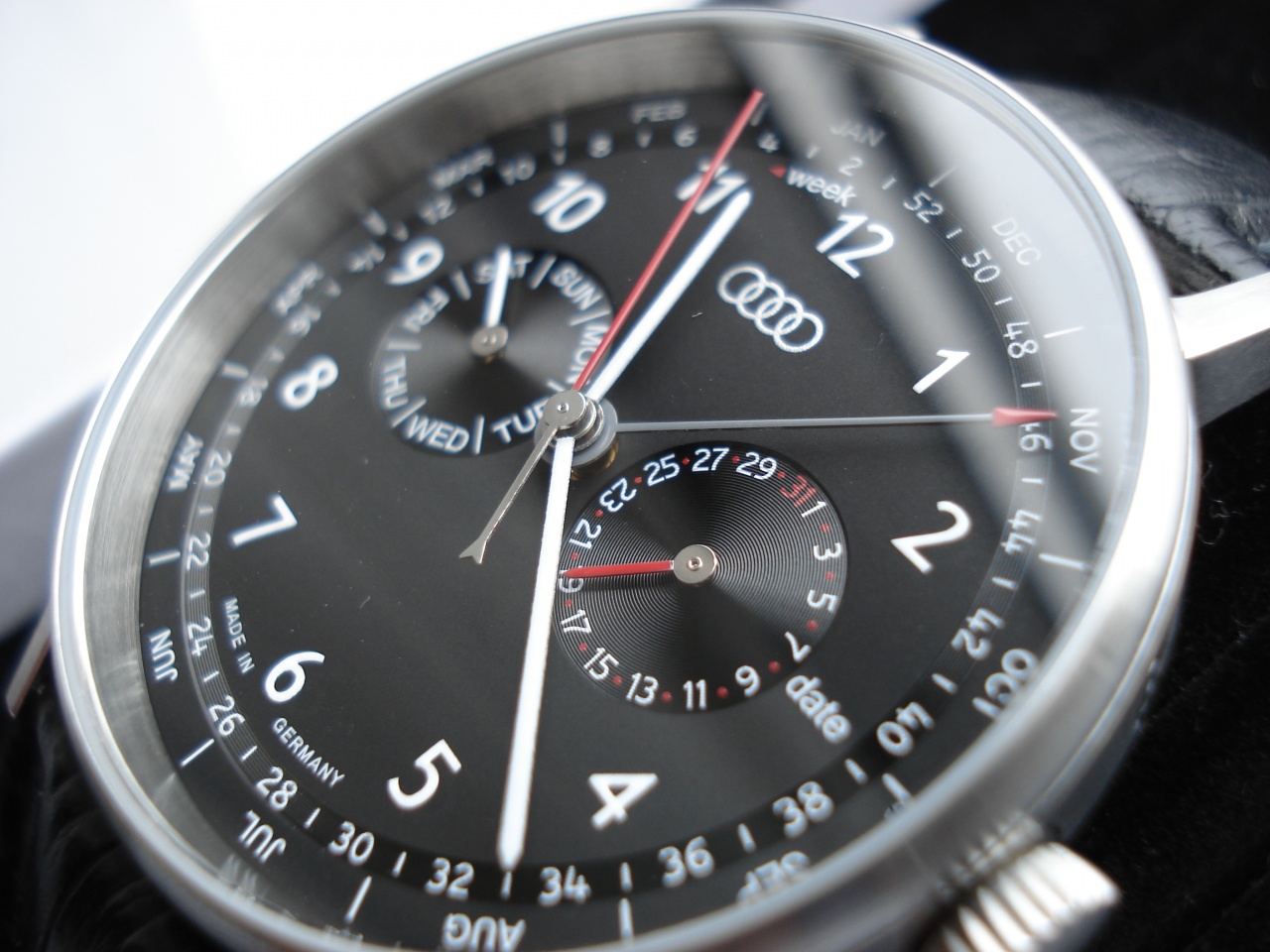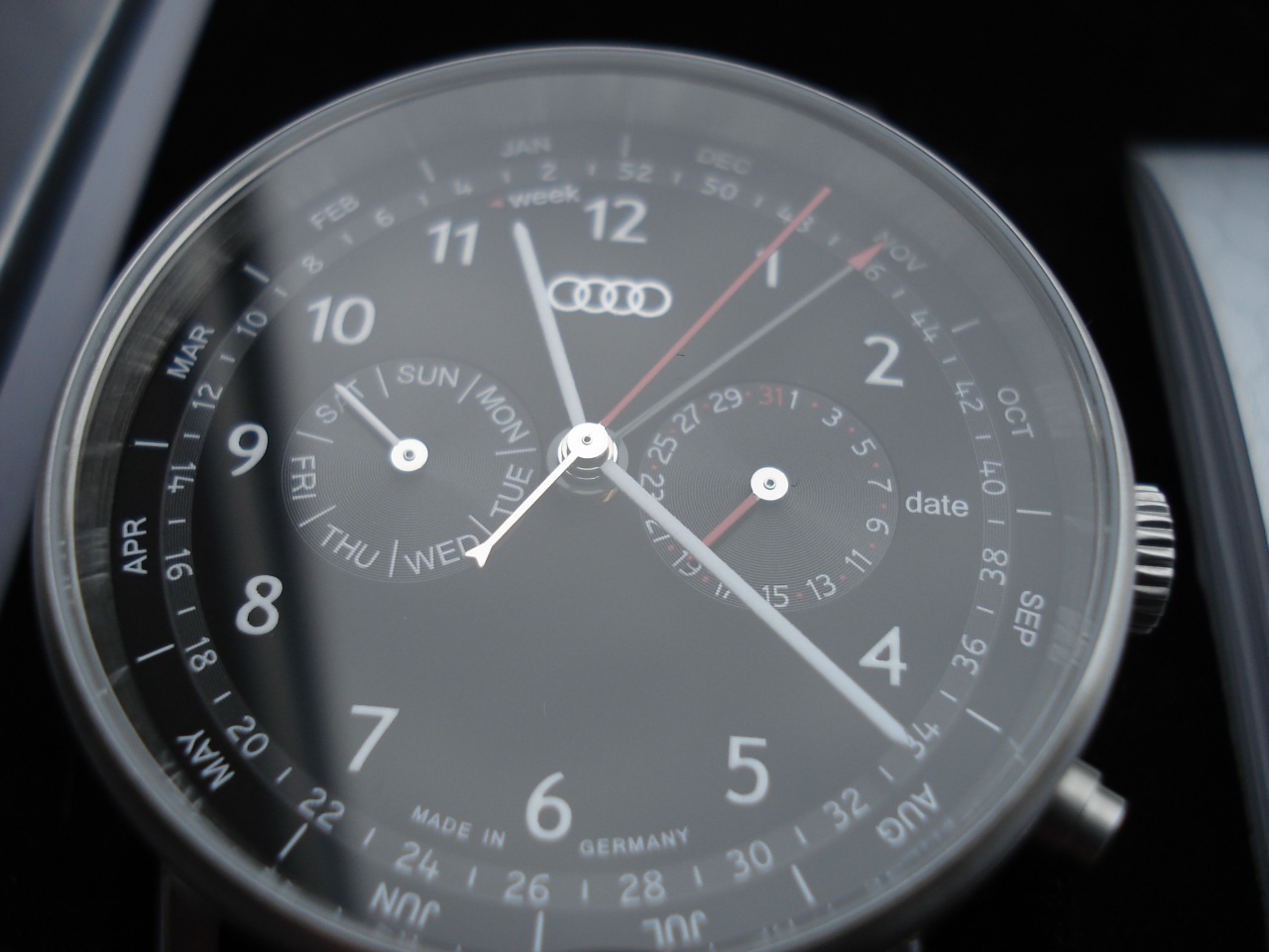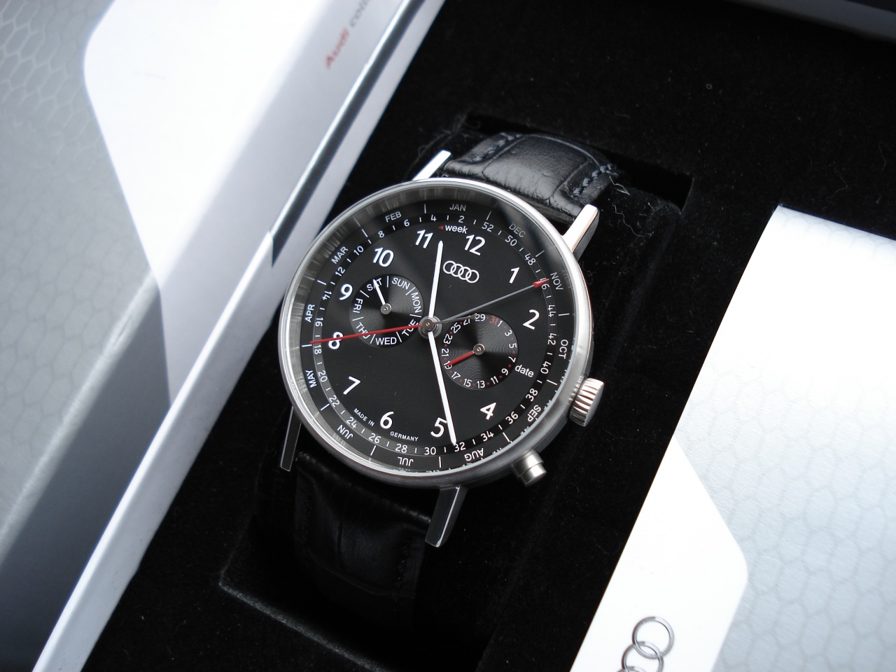 Сатинированный корпус из нержавеющей стали, фирменные кольца Audi на черном циферблате со светящимися цифрами и стрелками, изогнутое защитное стекло K1.