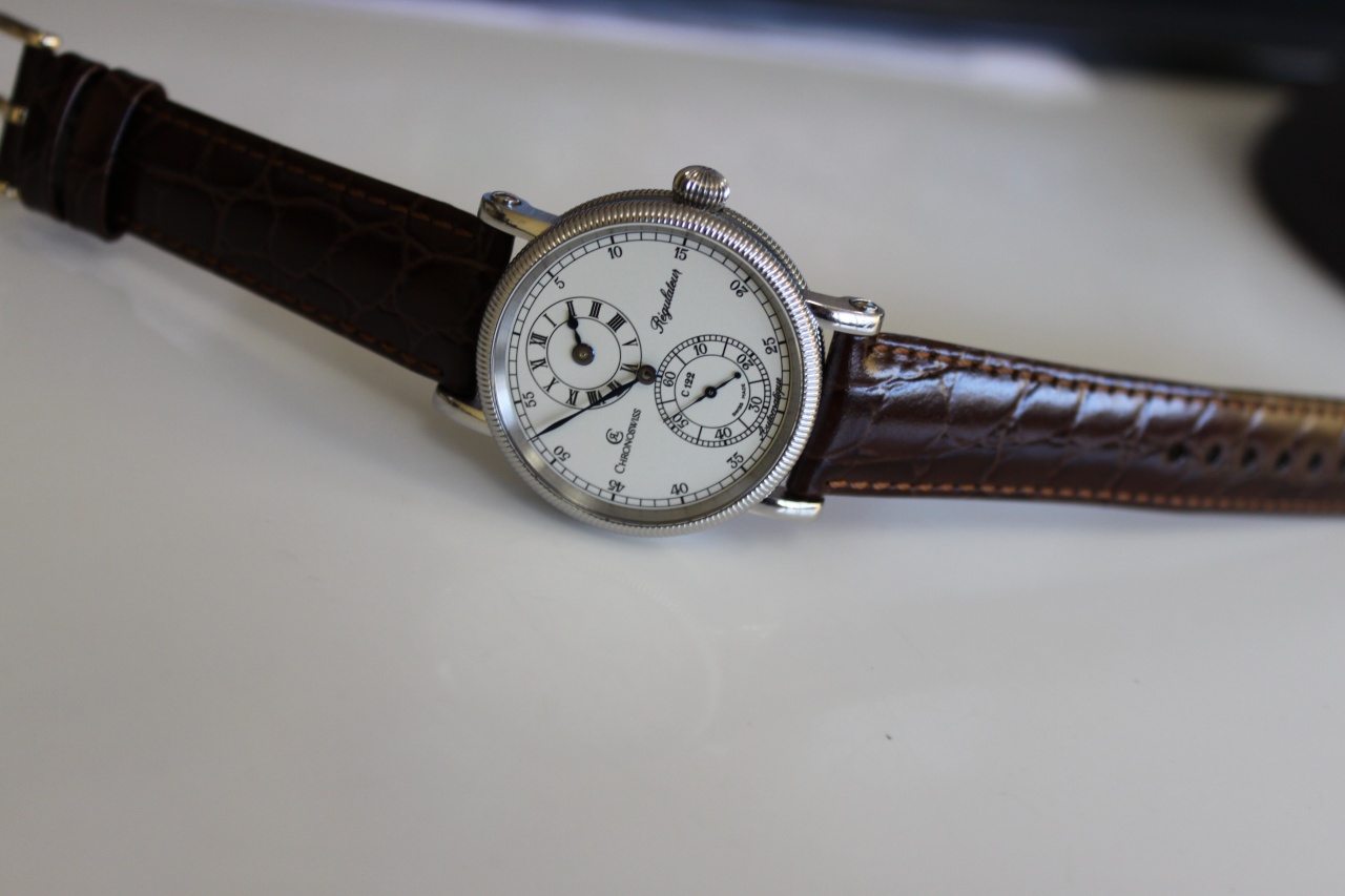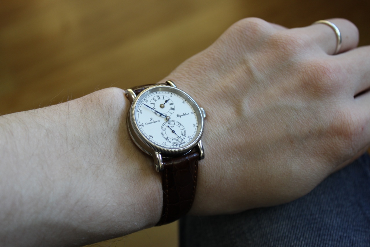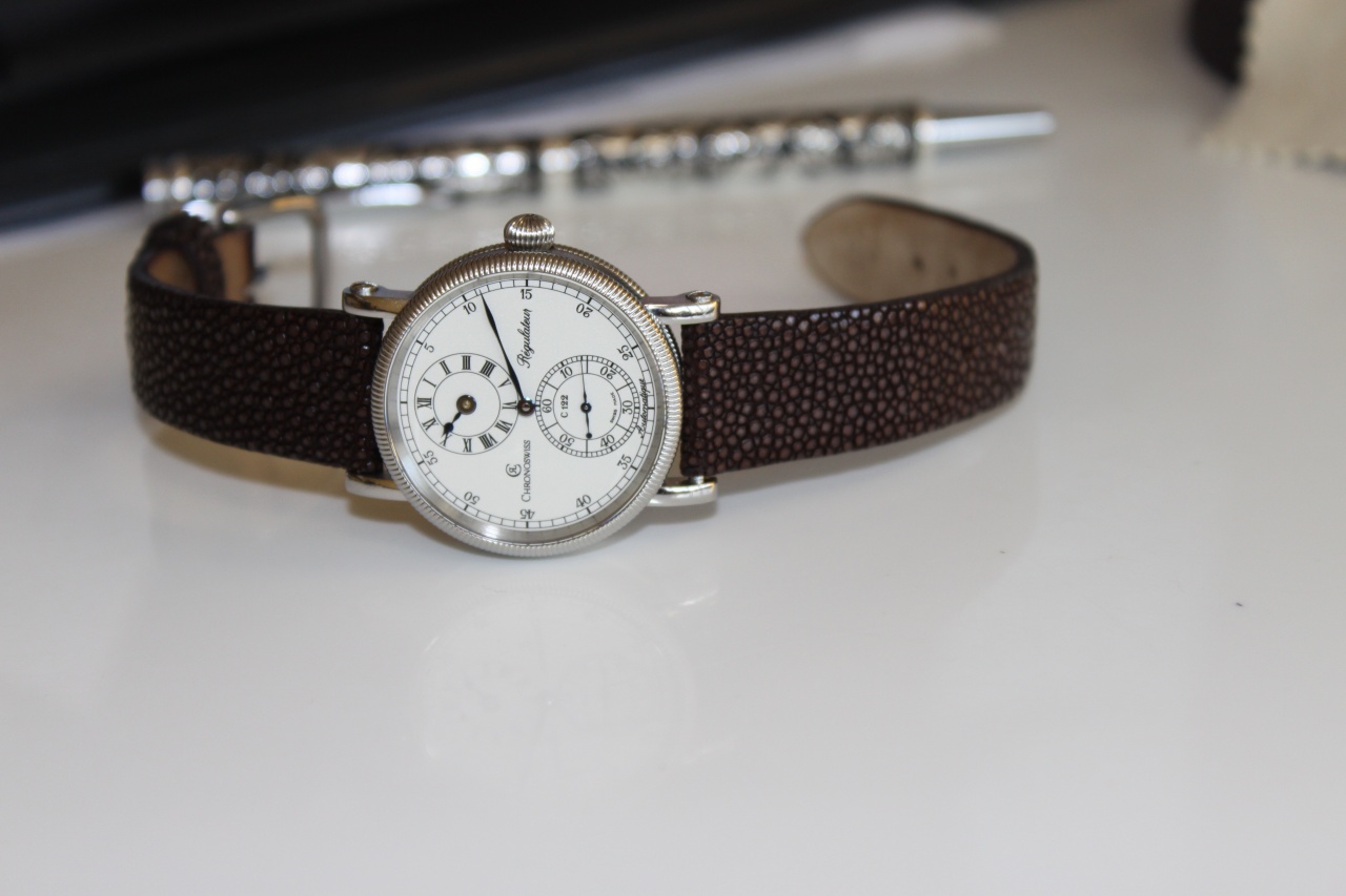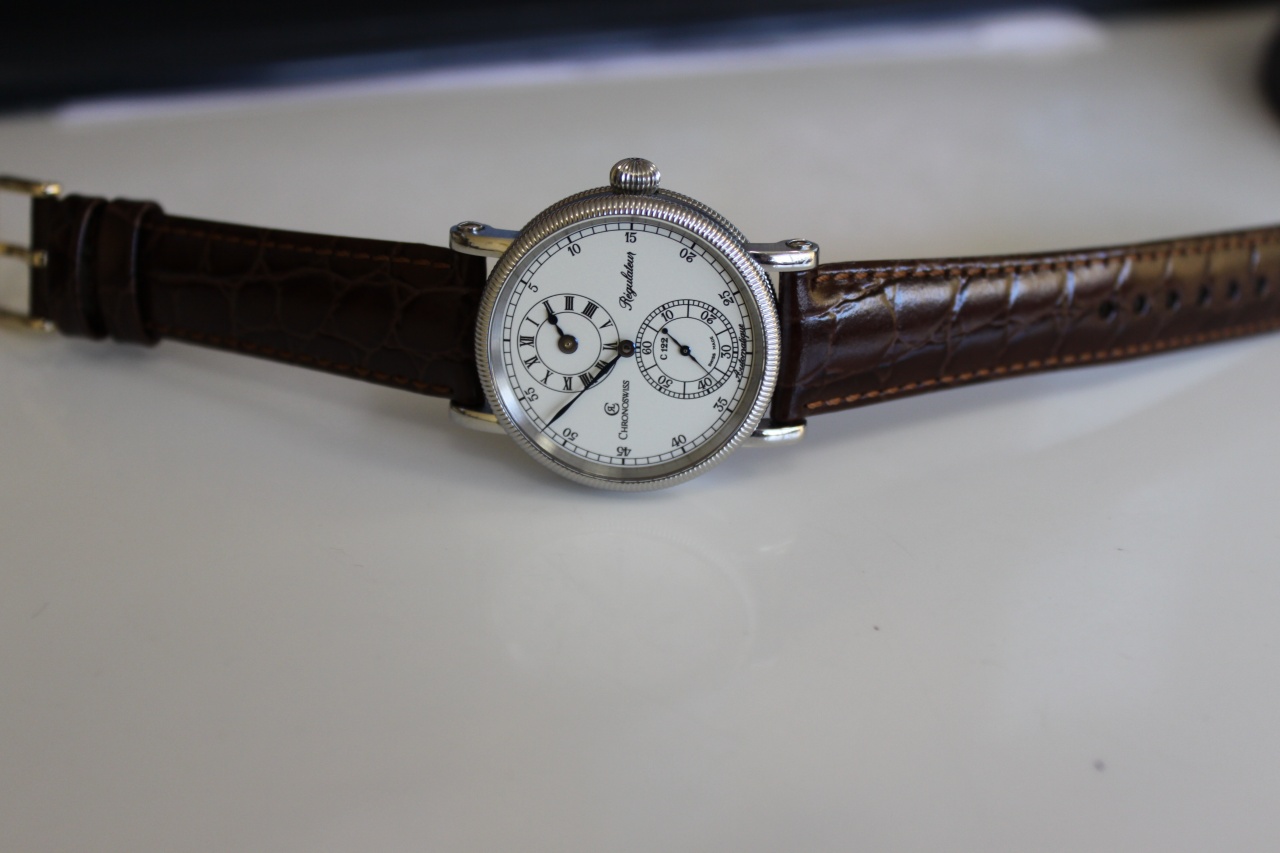 Часы-регулятор, относящиеся к классическому модельному ряду Chronoswiss: в центре белого серебряного циферблата расположена крупная минутная стрелка, часовая вынесена на дополнительный циферблат в зоне 12 часов, а в зоне 6 часов находится маленький секундный циферблат.