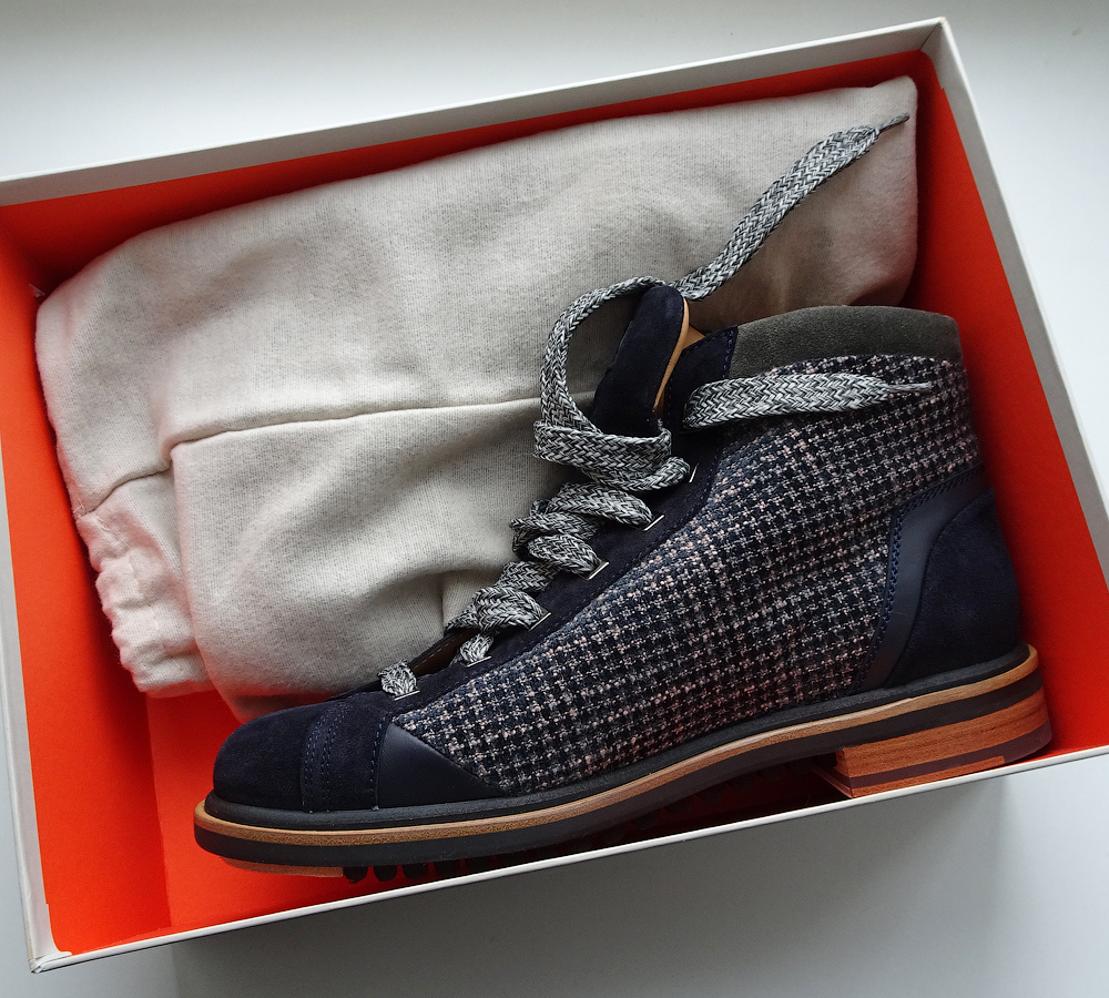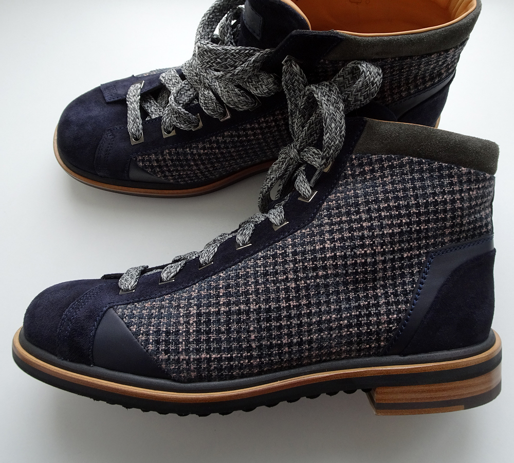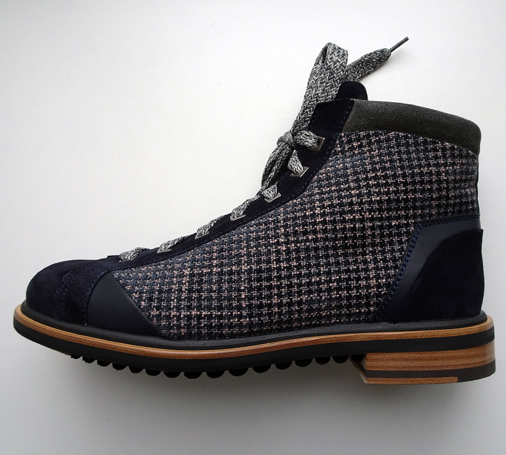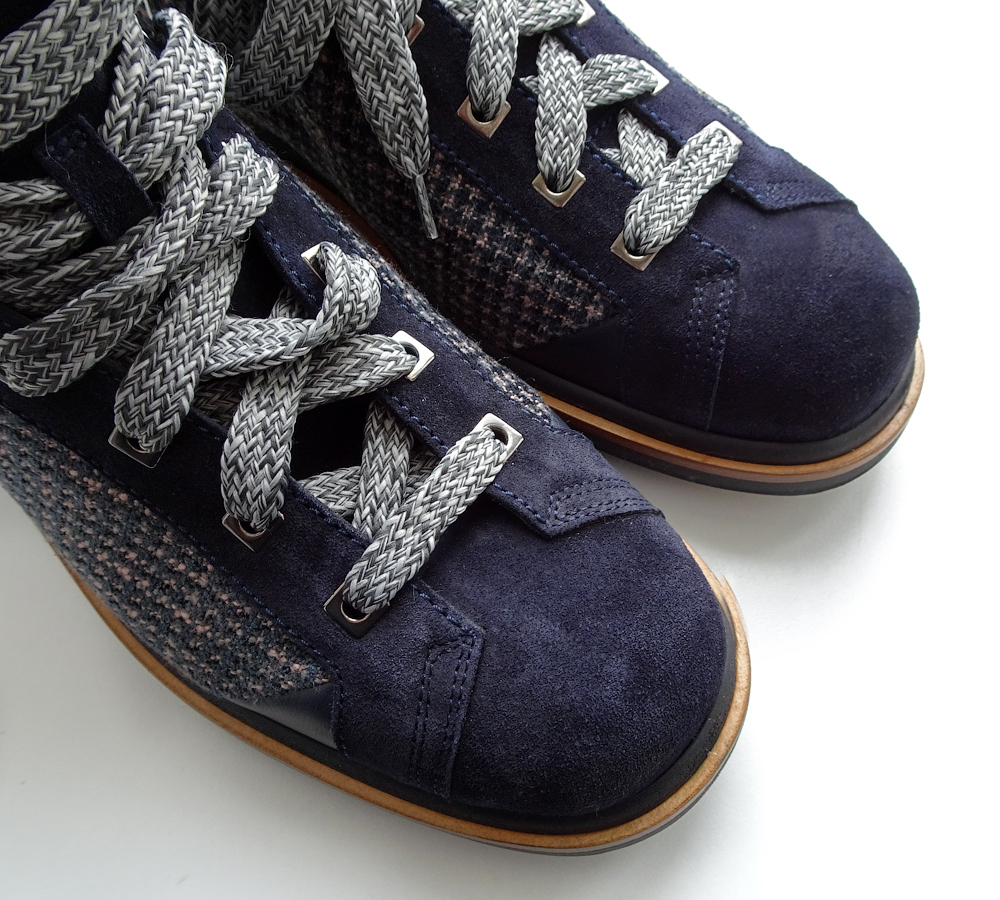 Темно-синяя с фиолетовым оттенком натуральная замша, детали из натуральной кожи, боковые вставки из фактурного твидового материала, контрастные широкие шнурки. Внутри полностью из кожи. Крепкая рельефная подошва.