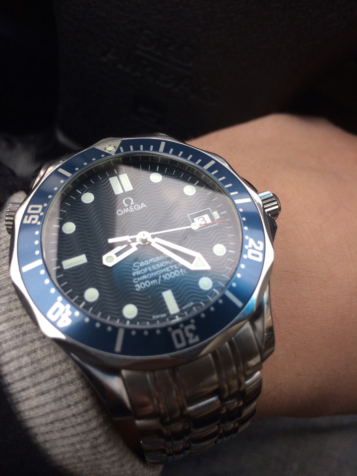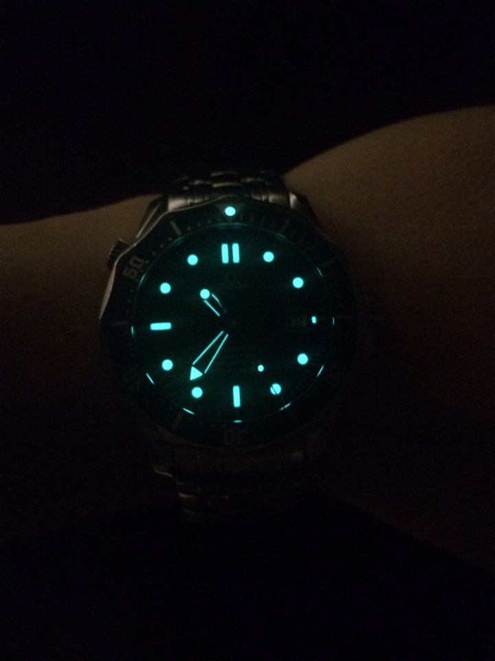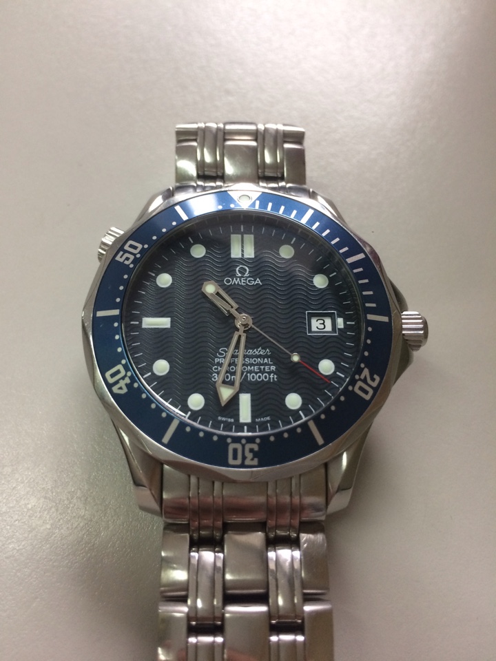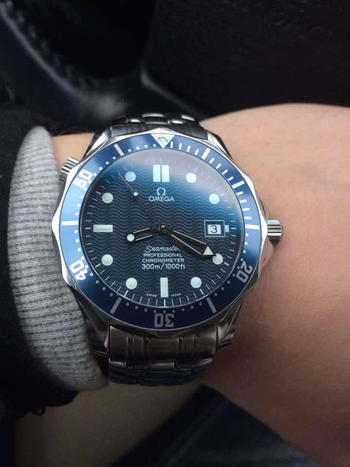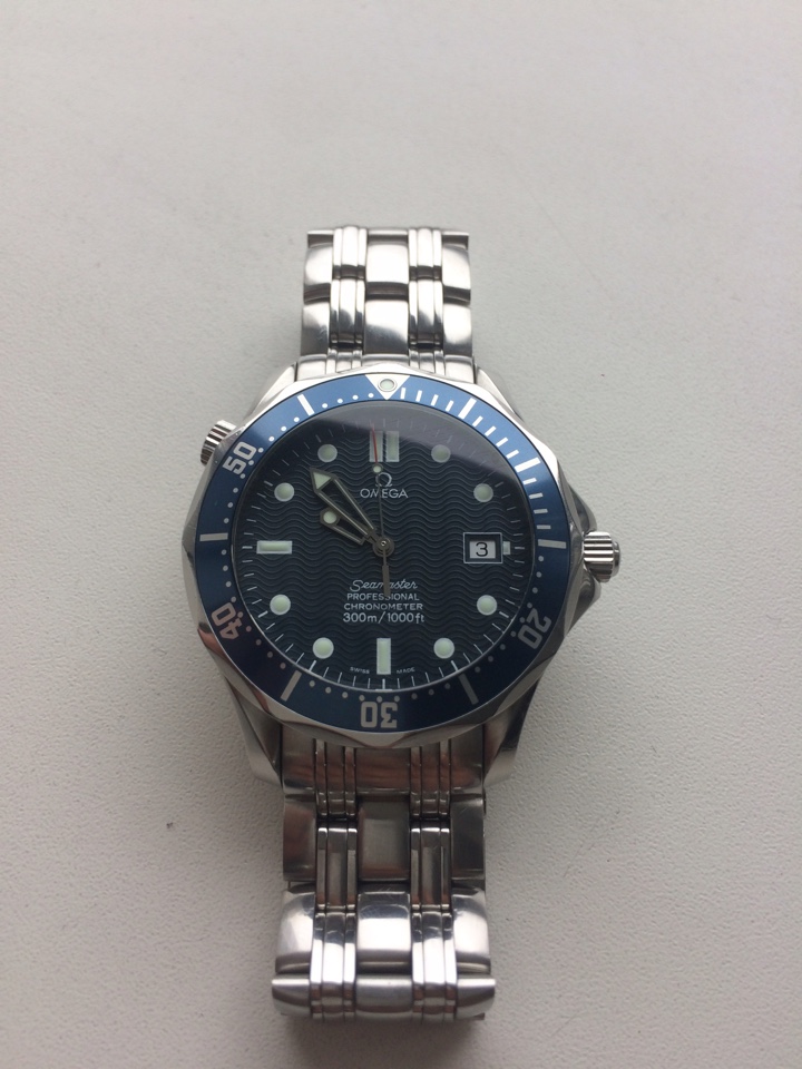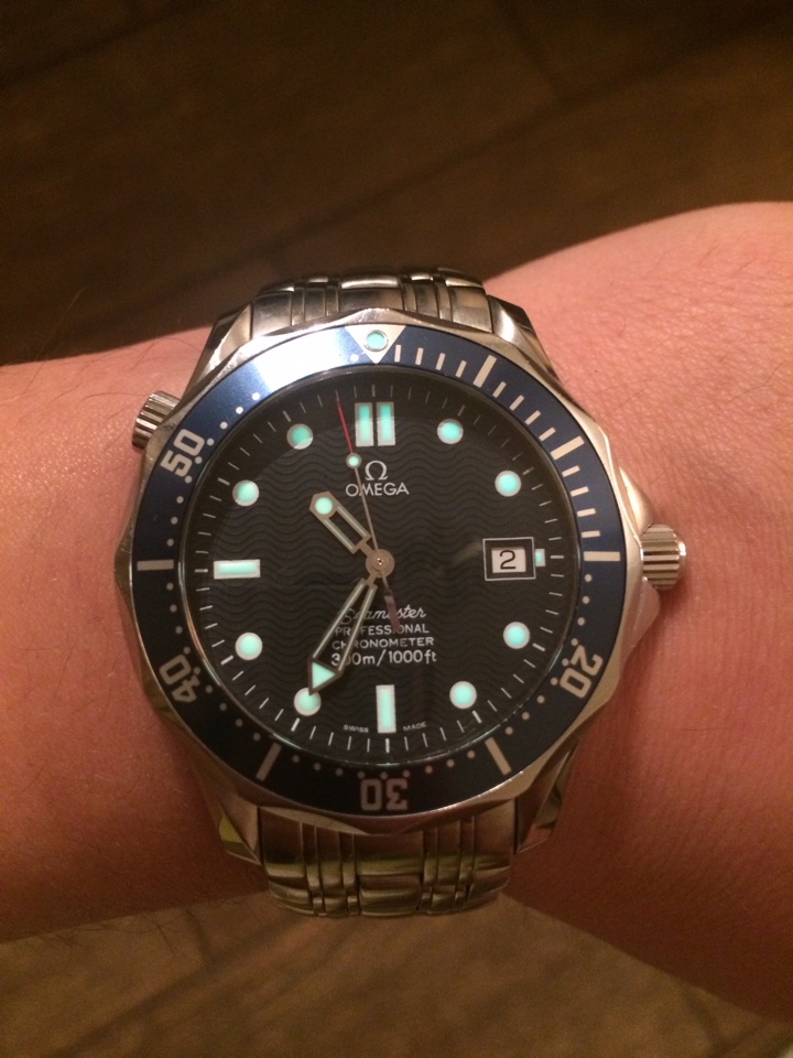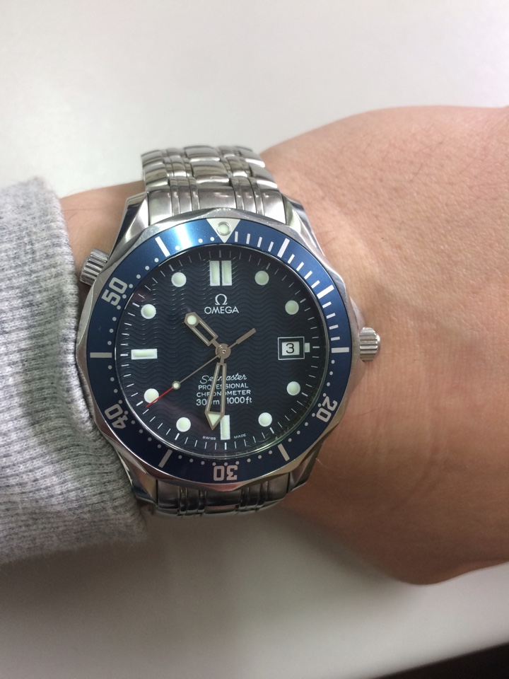 Легендарная Бондовская Omega Seamaster Professional Chronometer 300m. Одна из самых популярных и узнаваемых моделей Omega, классика на все времена. Состояние хорошее, в комплекте только часы. Браслет на широкое запястье. Люм светит достаточно ярко, фото во вложении в подтверждение.