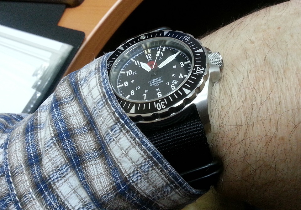 циферблат: черный матовый с двойной оцифровкой (1-12, 13-24) оцифровкой, синими и оранжевыми (на 12 часах) тритиевыми колбами, с датой между 4 и 5 часами