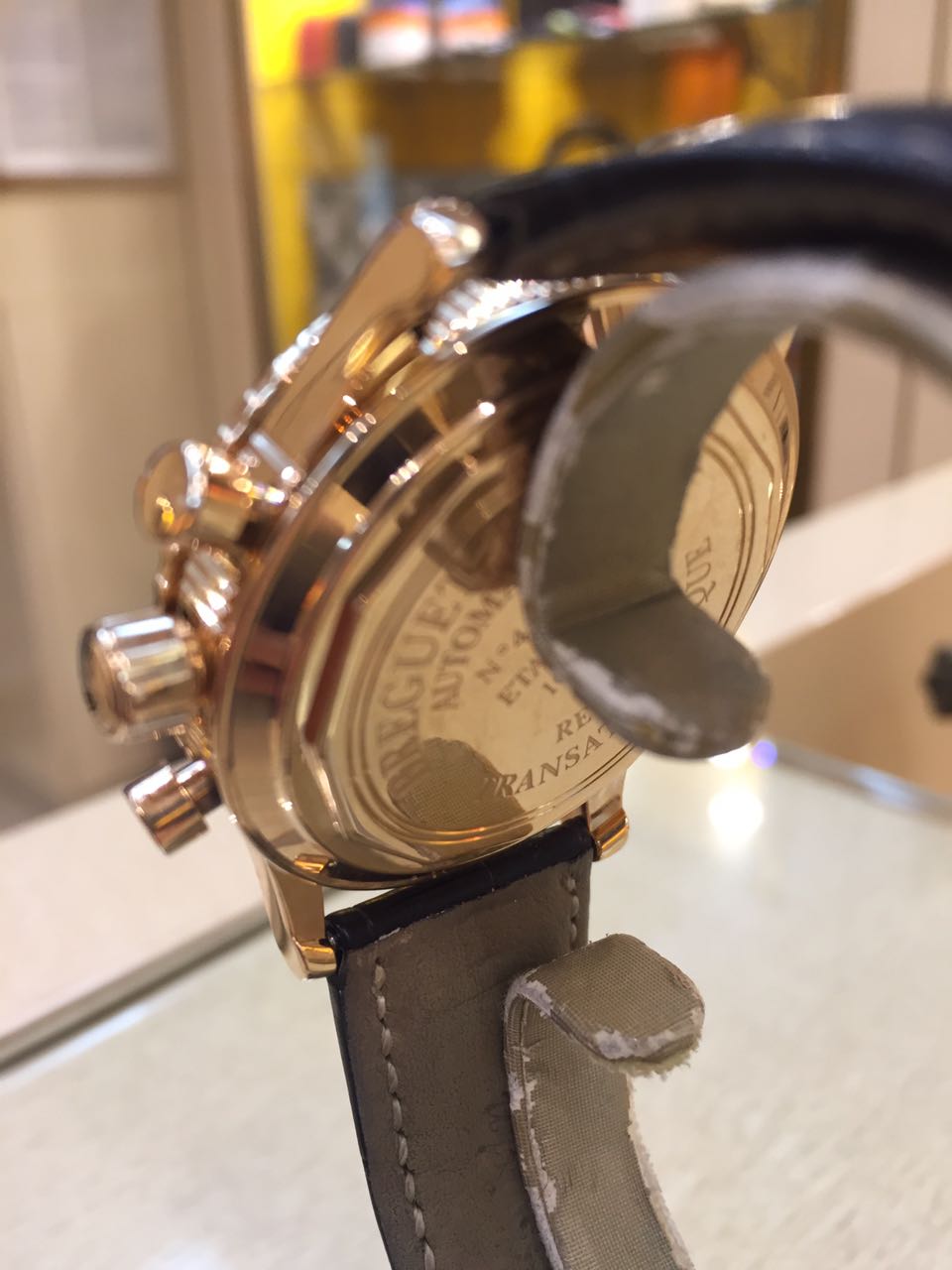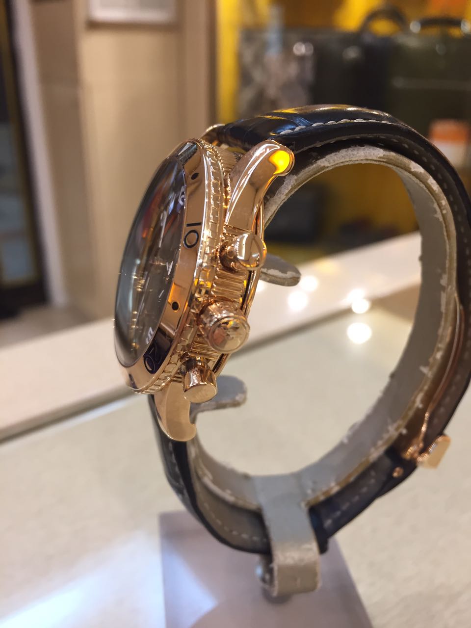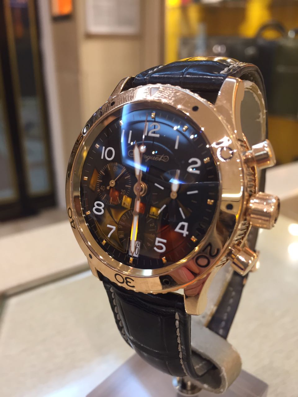 Потрясающая модель коллекции Type XX выполнена из розового золота и дополнена фактурным кожаным ремешком. Черный циферблат имеет арабские цифры, изящные стрелки с золотой окантовкой и окна счетчиков.