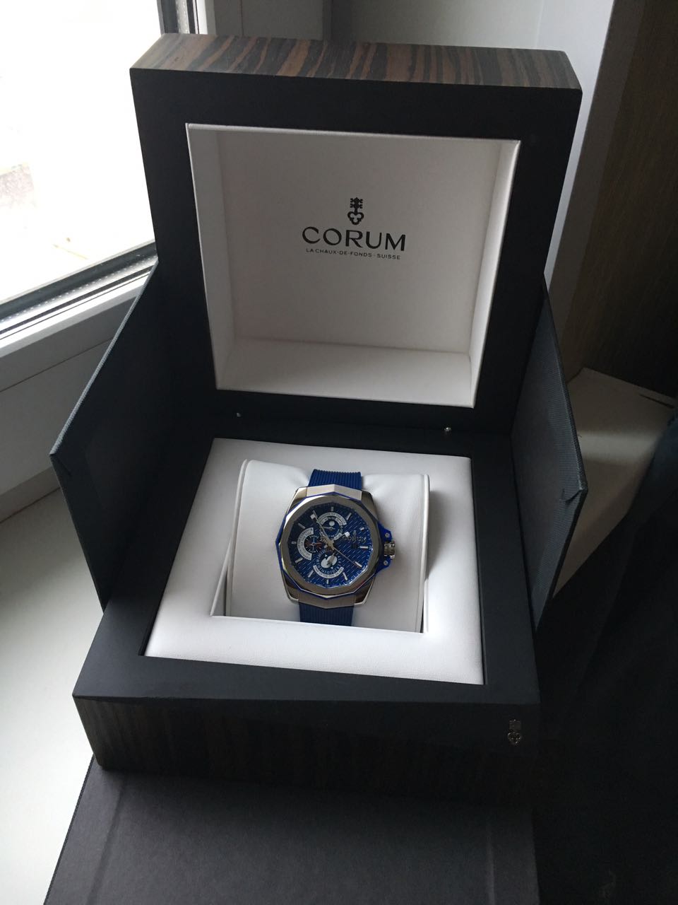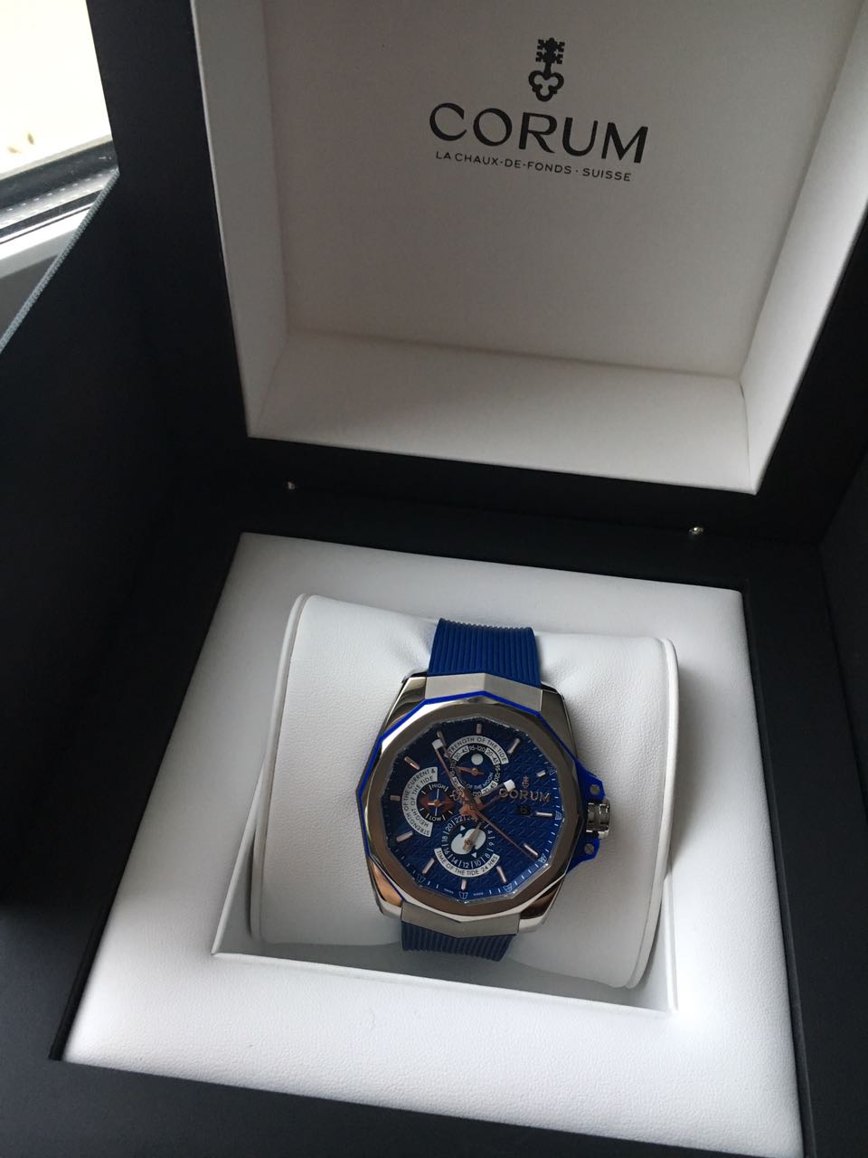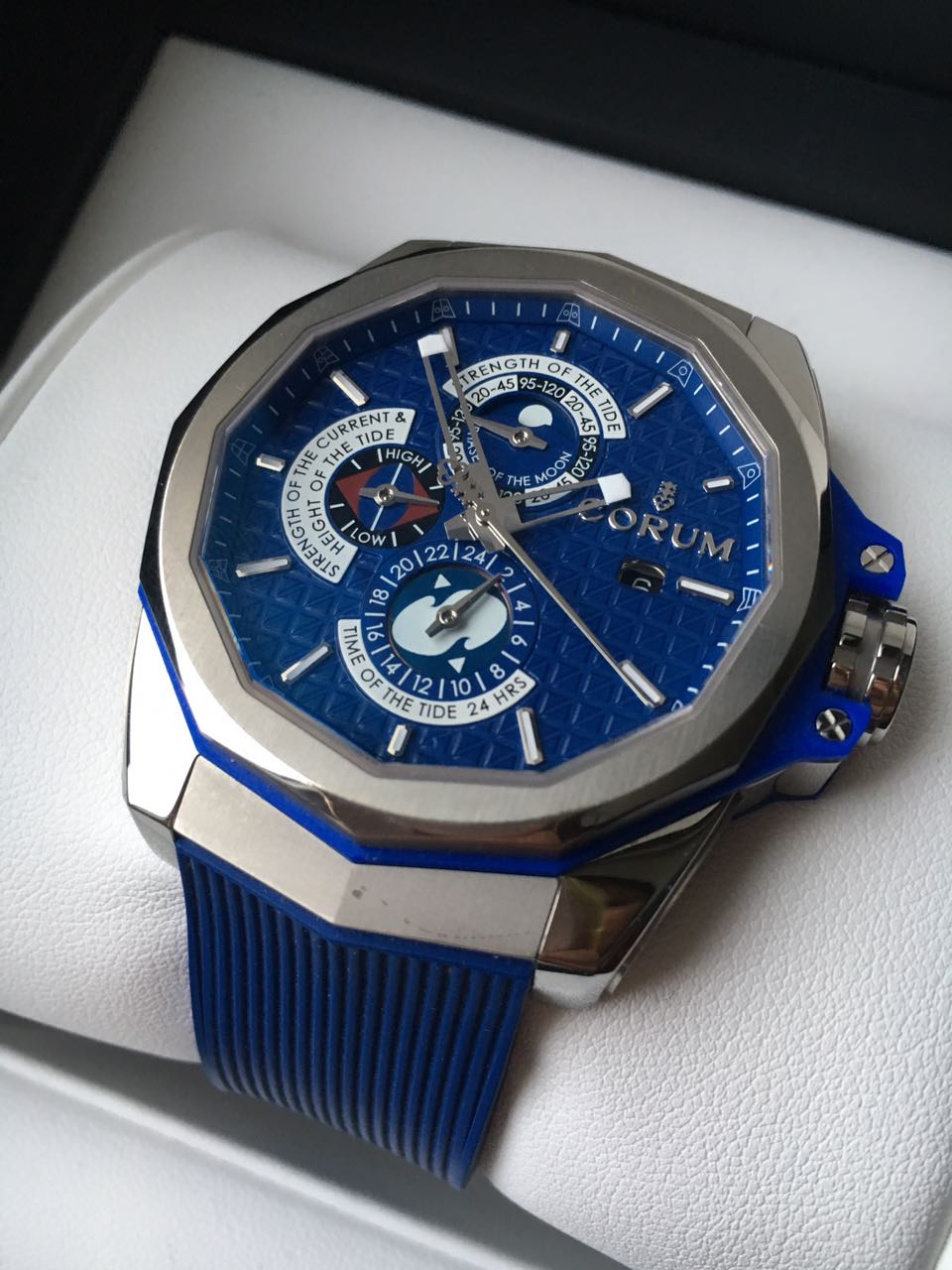 Corum модель Admiral’s Cup AC-One 45 Tides. Часовой механизм калибр CO 277, который скрывается внутри был разработан и создан в 1993 году. Эксклюзивный механизм разработан в сотрудничестве с астрономической обсерваторией Женевы и SHOM (гидрографические и океанографические Услуги Французского национального флота), находящейся в Бресте. В дополнение к обычным функциям хронографа, Admiral’s Cup AC-One 45 Tides оснащен индикацией лунного цикла и отображает информацию о высоких/низких приливах. Данная модель выполнена из легкого, и в тоже время прочного титана. Наделен стильным синим циферблатом с эксклюзивной отделкой.