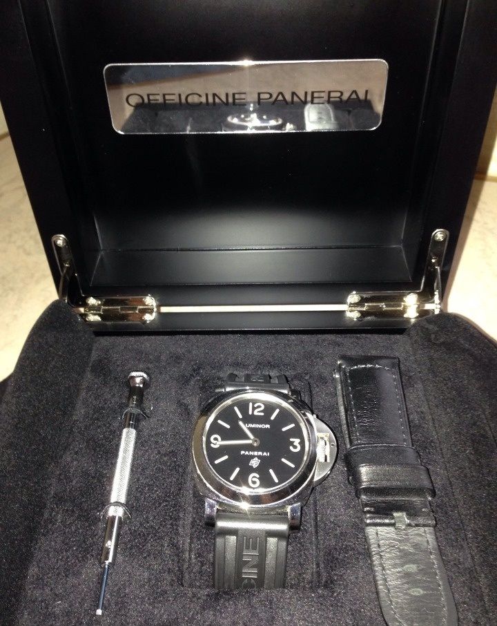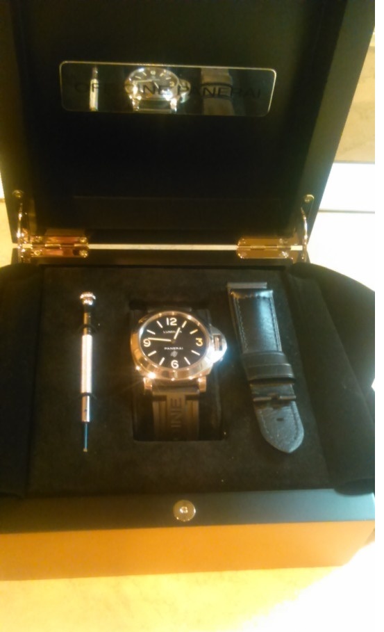 Полный комплект с коробкой (дерево) и документами, 1й каучуковый, 2й кожаный ремень + отвёртка.