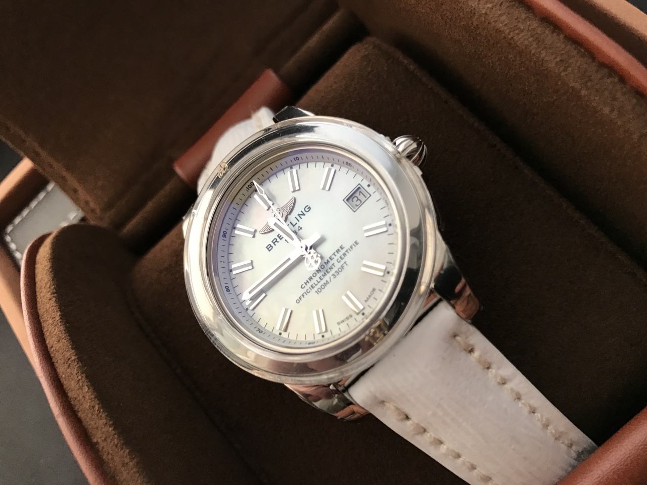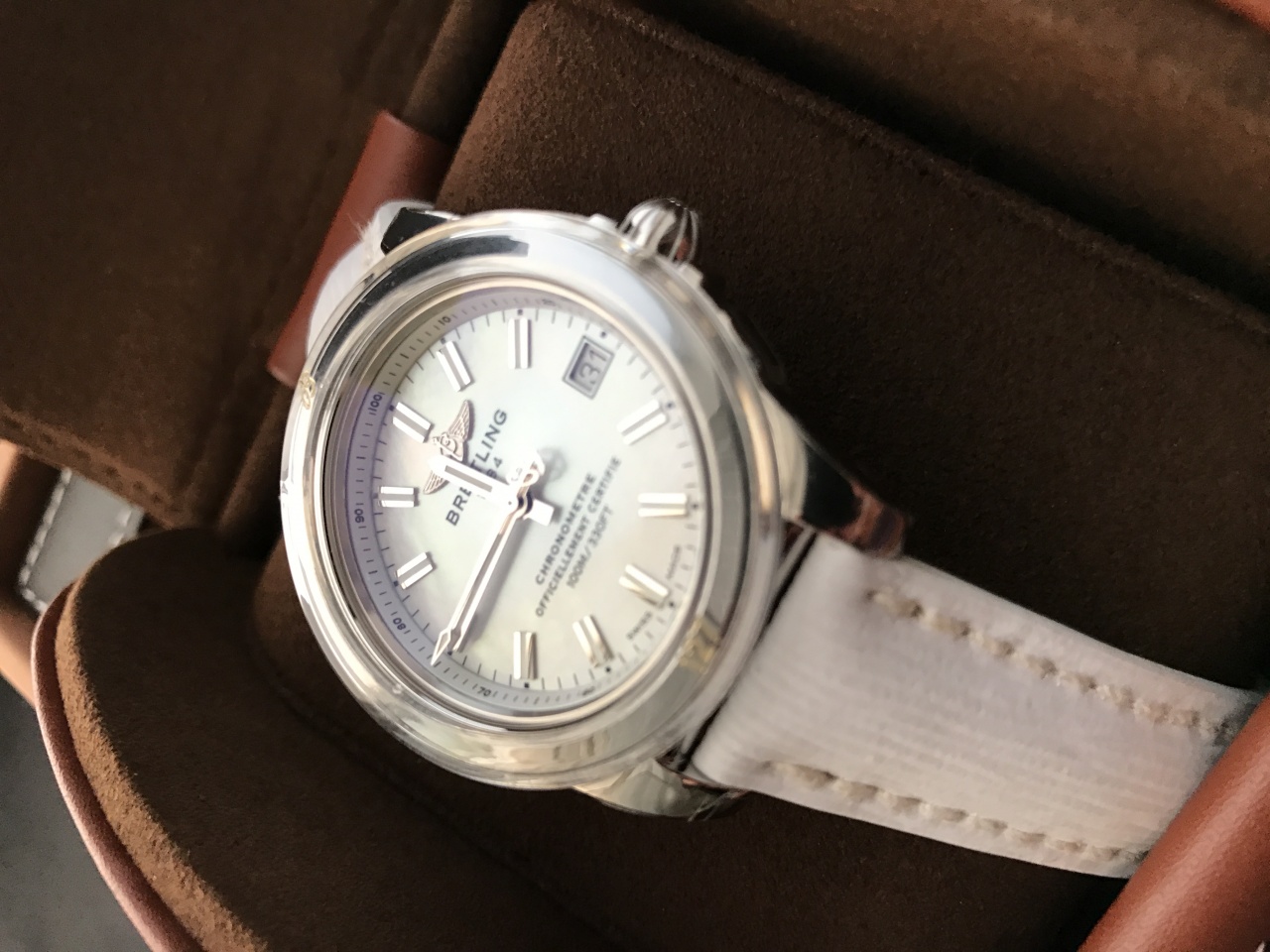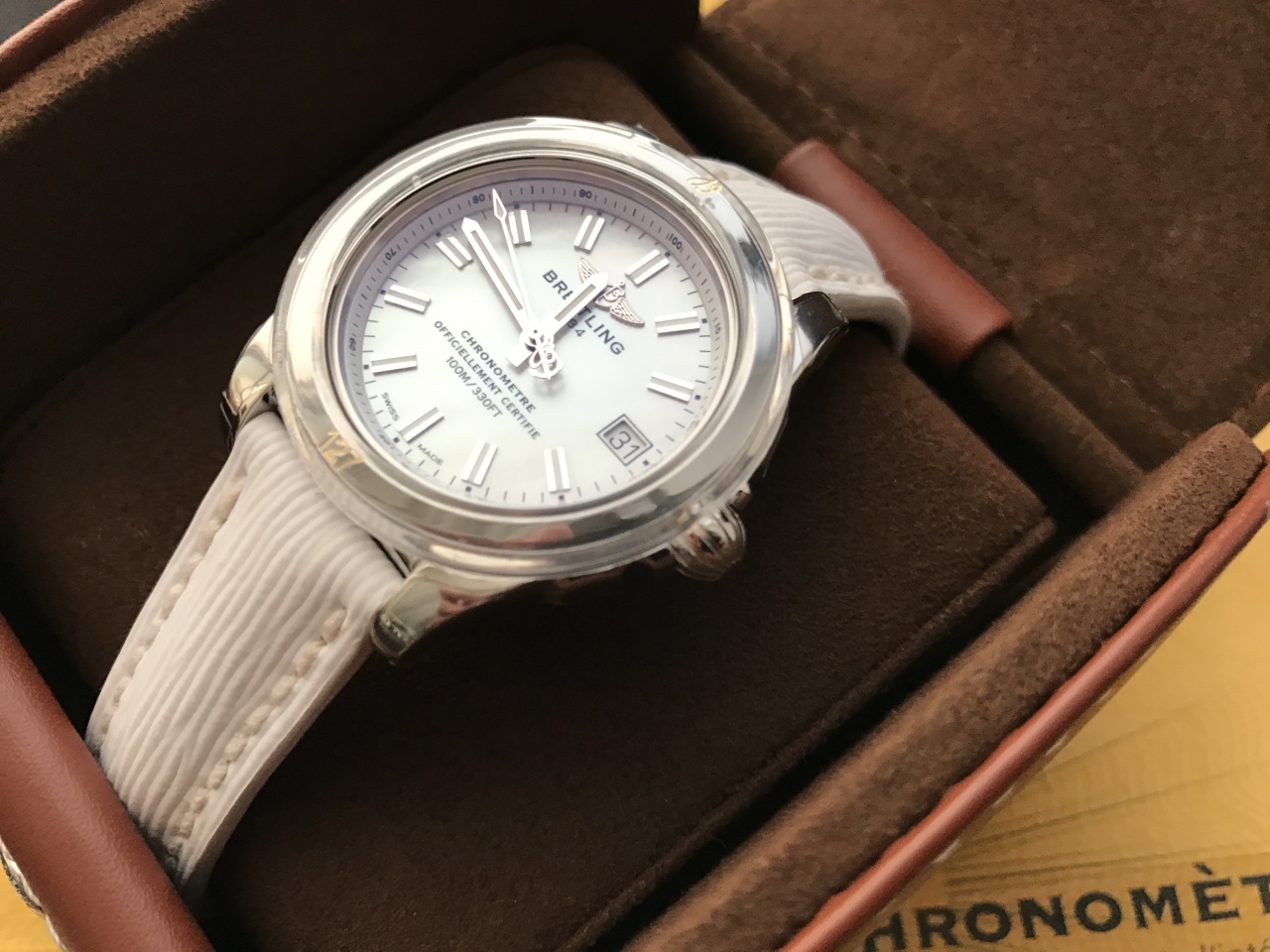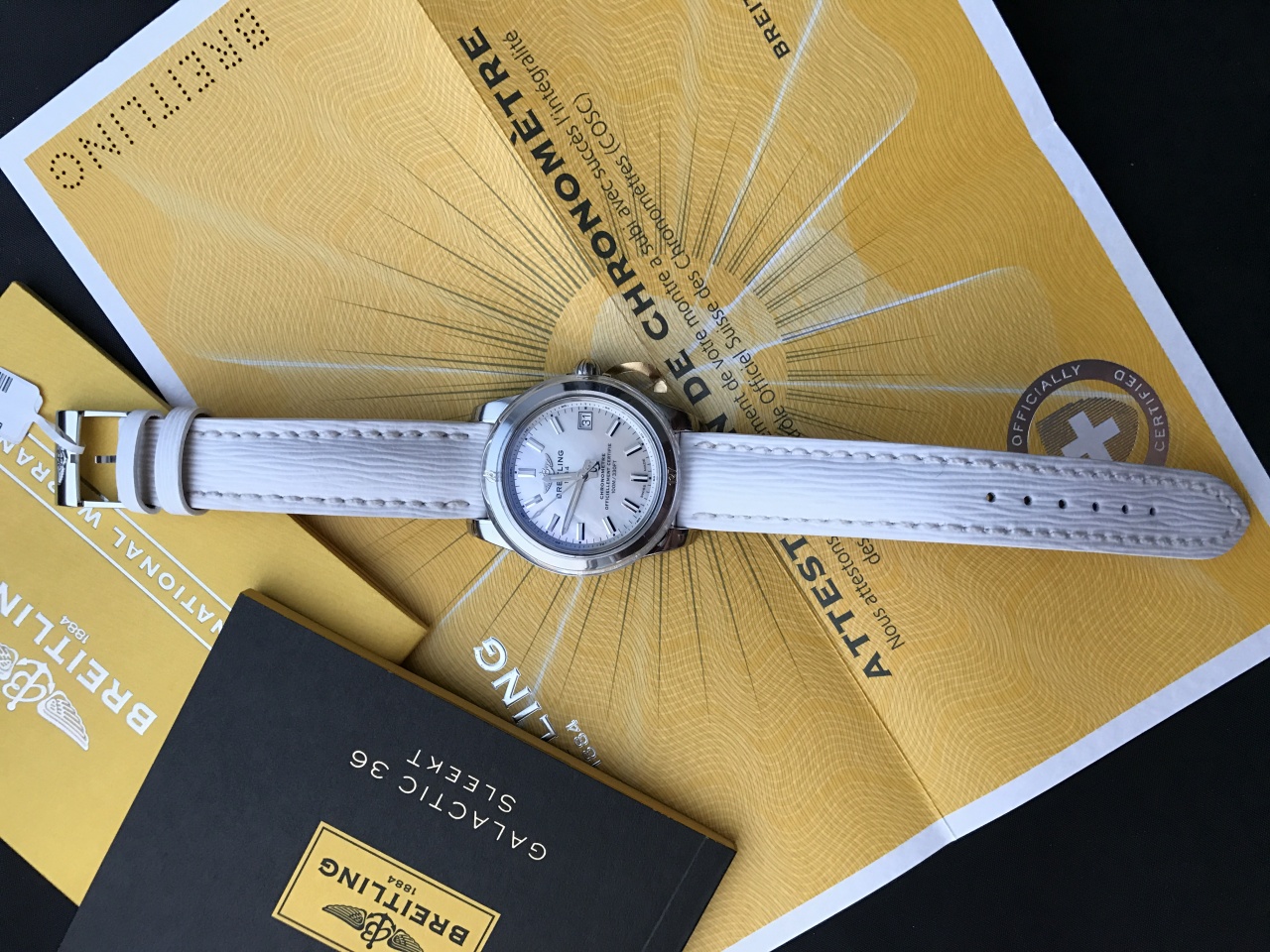 Уважаемые форумчане, в продаже изумительные женские BREITLING GALACTIC. Роскошный перламутровый циферблат, великолепный белый ремень Sahara и конечно же сверхточный калибр Breitling 74 SuperQuartz™. Часы полностью в пленках, полный комплект коробок и документов.