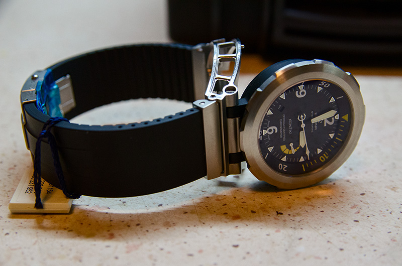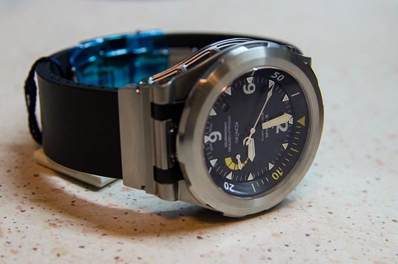 Механизмом фиксации безеля и заводной головки (такого Вы ещё не видели). Кстати, эргономика тоже на высоте. Специальные петли у креплений ремня к корпусу и корпус из титана, делает ношение этих Зверюг даже на руке 17-18 см - достаточно комфортным. А толстый безель визуально уменьшает заявленные 46 мм и часы смотрятся достаточно органично. Очень удобна раскладная застёжка - бабочка с удлинителем.