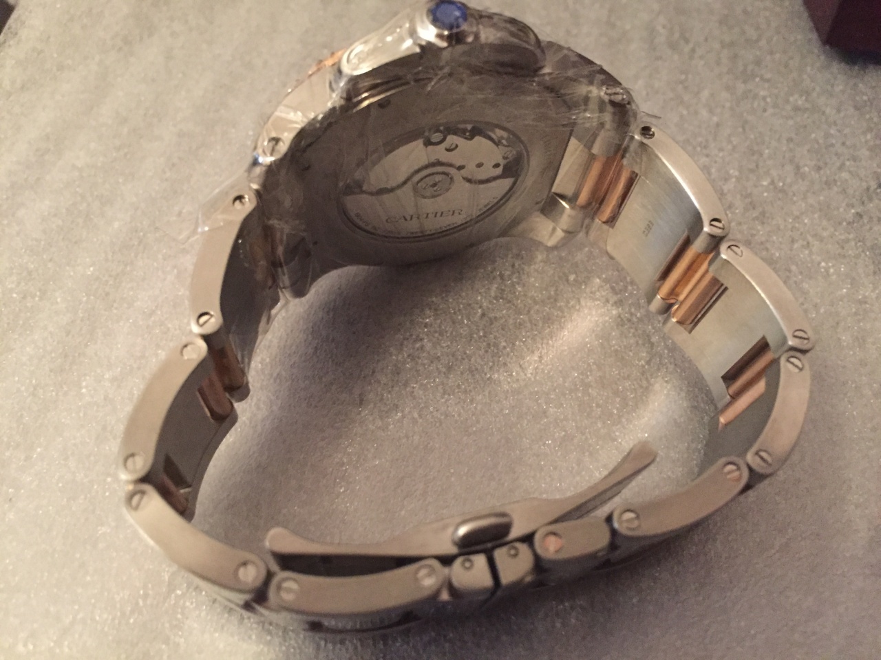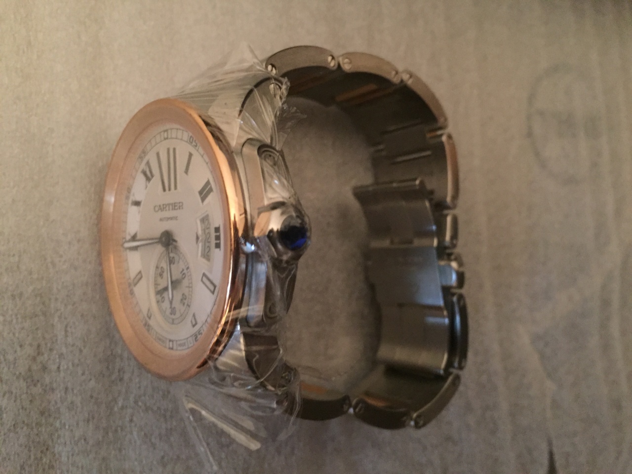Часы Calibre de Cartier, 42 мм, механизм с автоматическим подзаводом, калибр 1904-PS MC, корпус из стали, ободок из розового золота 18 карат, граненая заводная головка из стали украшена граненой синтетической шпинелью синего цвета, посеребренный опаловый циферблат с цифрой XII, частично покрытый спиралевидным узором, часовые метки, окошко, счетчик, секундная шкала в стиле "железная дорога" с 4 люминесцентными точками по внешнему краю циферблата, декалькированные черные часовые метки и 7 римских цифр, люминесцентные черные стрелки в форме мечей из оксидированной стали, сапфировое стекло, браслет из стали и розового золота 18 карат, система блокировки, окошко даты в положении "3 часа", малый секундный счетчик в положении "6 часов", задняя крышка из сапфирового стекла. Высота корпуса: 10 мм. Водонепроницаемость до 3 бар (30 метров).