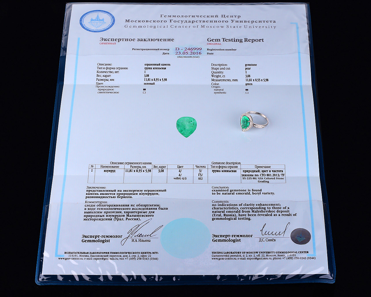 Бриллиантовое кольцо с необлагороженным изумрудом 3.08ct