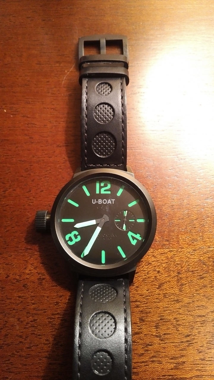 Механизм: ETA Cal. 6497, высотой 4,50 мм, специально персонифицированный и настроенный для U-Boat c левосторонним положением заводной головки. 18800 полуколебаний в час (2,5 Гц). 17 камней. Запас хода 46 часов. Сапфировое стекло, устойчивое к царапинам, толщиной 2 мм. Специальный защитный колпачок заводной головки с запатентованной технологией. Корпус из высококачественного стального сплава 316L с высокими антикоррозийными свойствами. Корпус с полным IP покрытием черного цвета. Размеры корпуса: диаметр 50 мм, толщина 13,7 мм. Вес 110гр. Люминесцентные стрелки и метки.