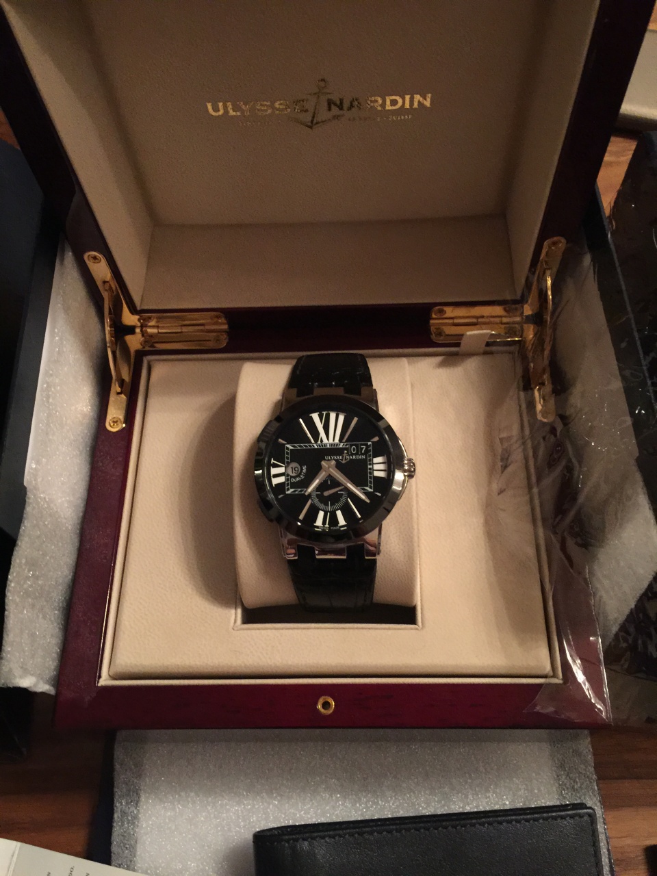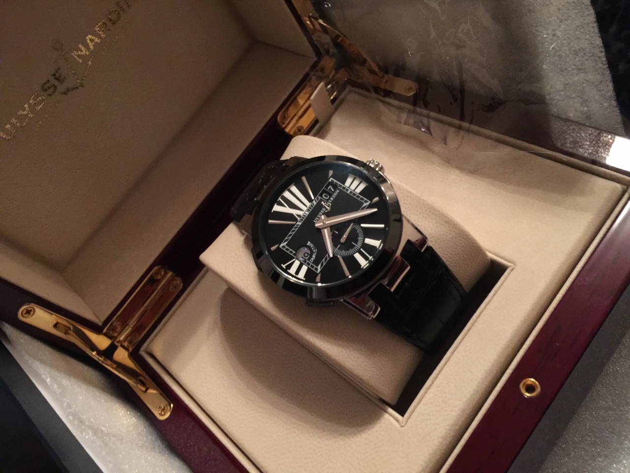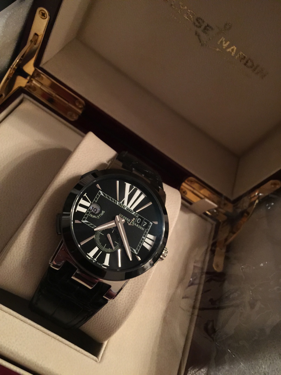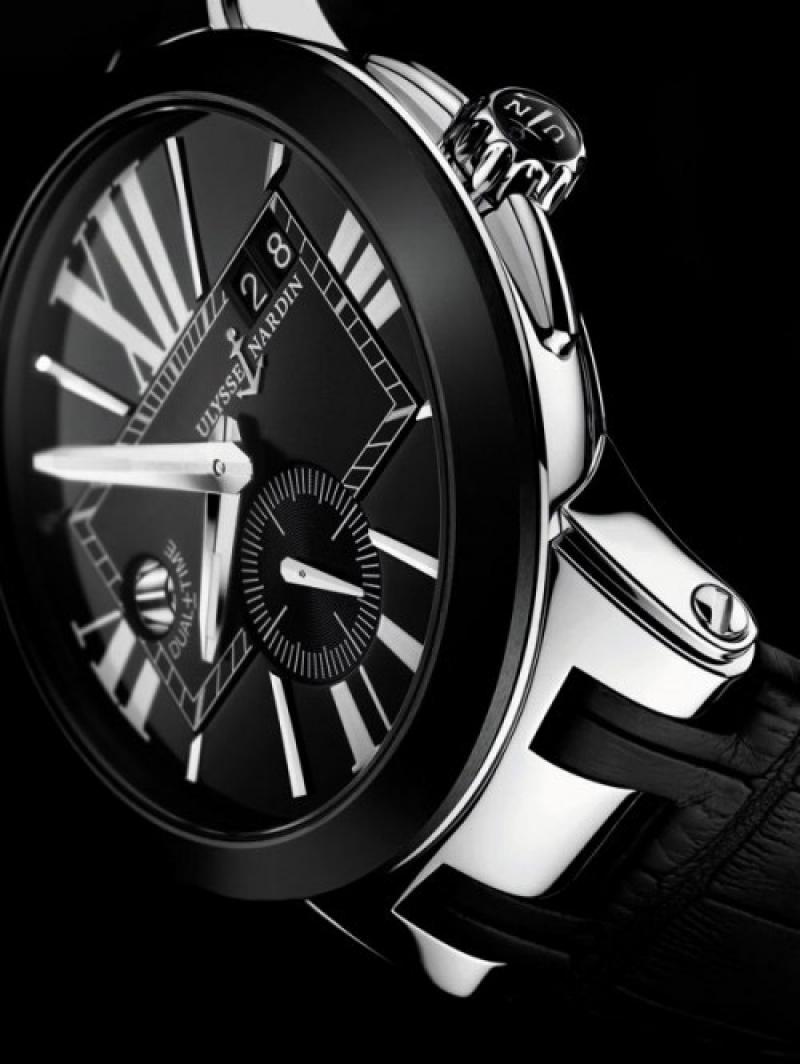 Дерзкий дизайн часов Executive Dual Time запоминается с первого взгляда. Черный циферблат рассечен большими римскими цифрами и декорирован уникальными трёхгранными стрелками. Маленькая секундная стрелка на дополнительном циферблате в положении «6 часов» и большой указатель даты в положении «2 часа» в двойном окошке остаются традиционными для коллекции Dual Time. Элегантные кнопки переключения часового пояса, расположенные на корпусе в положении «8» и «10 часов» выполнены из керамики. При нажатии кнопок часовая стрелка меняет положение, в то время как указатель домашнего времени на отметке "9 часов" продолжает свой 24-часовой цикл. Выполнены часы в корпусе из нержавеющей стали диаметром 43 мм, безель керамический. Прозрачная задняя крышка позволяет видеть впечатляющий механизм с автоподзаводом. Фиксируемую на резьбе заводную головку украшает исторический символ легендарной мануфактуры – якорь. Внутри корпуса установлен автоматический механизм UN-24 с запасом хода 42 часа. Водонепроницаемость корпуса до 100 метров. Часы поставляются на черном ремешке из кожи аллигатора с застежкой из нержавеющей стали