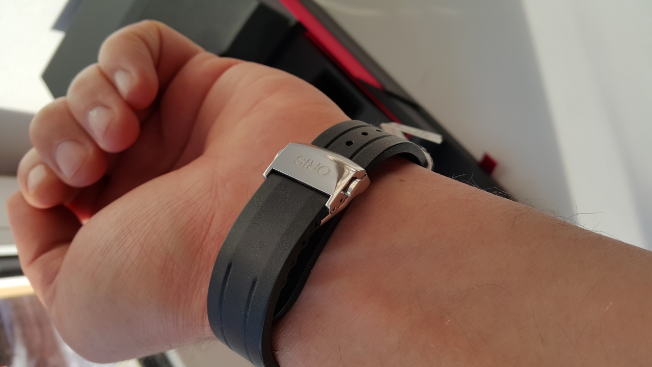Чёрный каучуковый ремешок, раскладывающаяся застежка из нержавеющей стали.