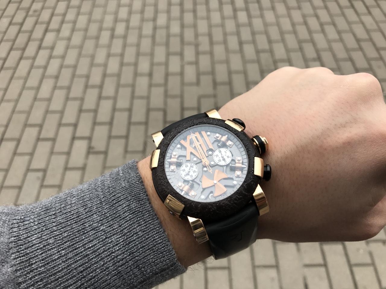 Циферблат: серый скелетизированный , золотые метки и стрелки