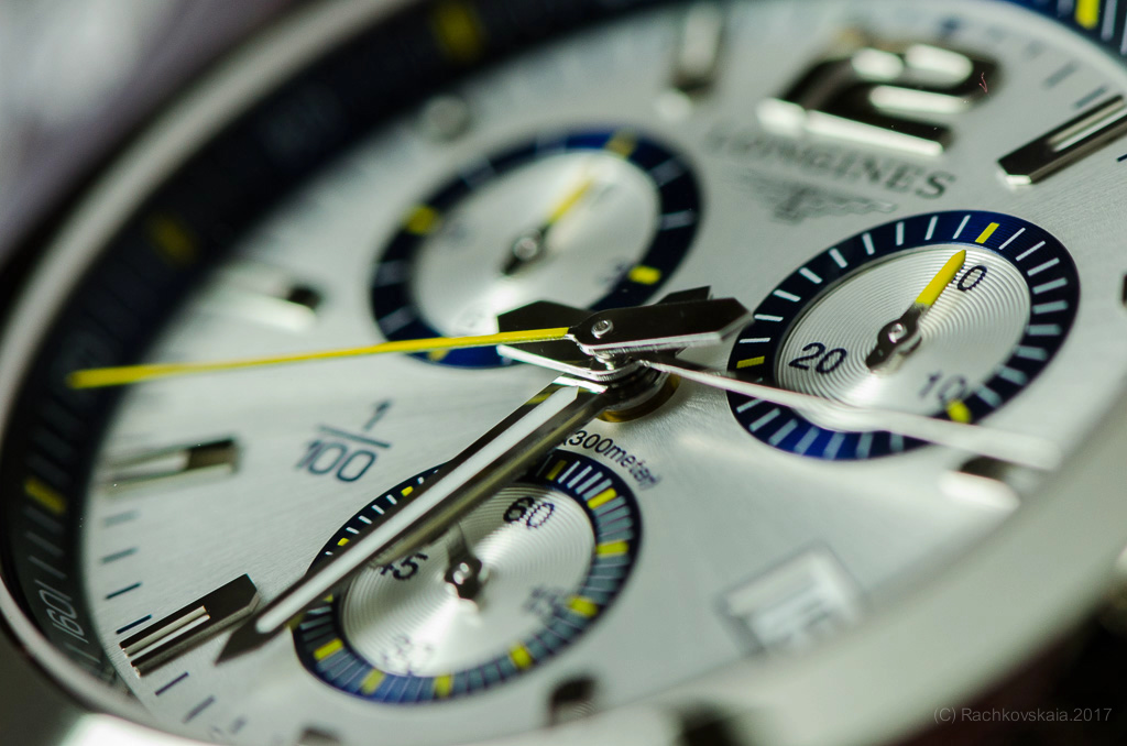 Функции: хронограф с возможностью измерения 1/100 секунды, часы, минуты, секунды и дата;