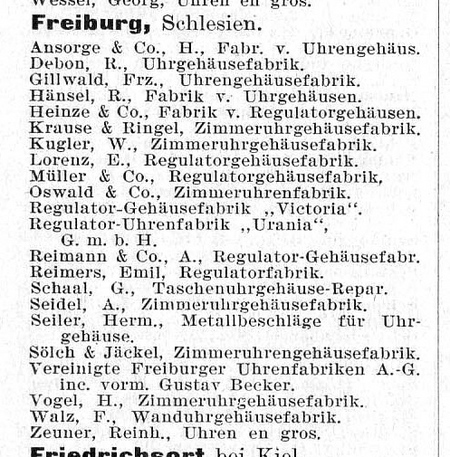 Так в адресной книге 1904 года во Фрайбурге насчитывалось не много ни мало 22 производства (см. первую картинку), так или иначе относящихся к часовому делу (фабрики производящие часы, корпуса, остастку). И это, стоит заметить, уже после объединения большинства имевшихся крупных фабрик в VFU/GB (Vereinigten Freiburger Uhrenfabriken vormals Gustav Becker) в 1899-м.