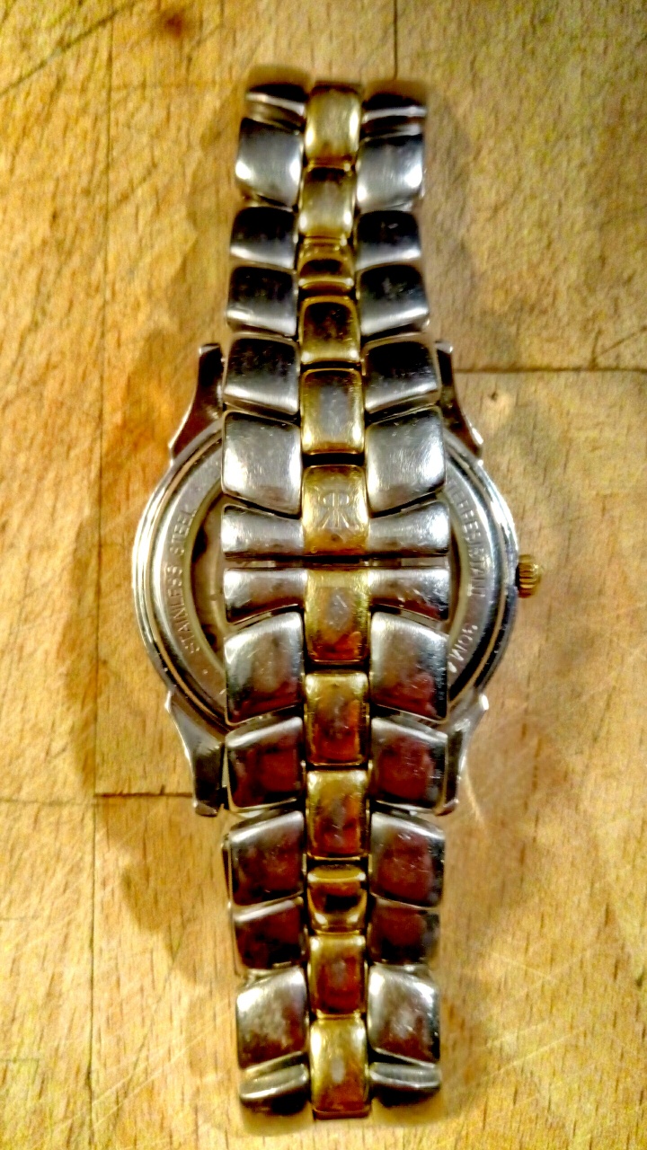 Полированный корпус из нержавеющей стали 34mm с золотым покрытием, сапфировое стекло с антибликовым покрытием, ремешок выполнен из нержавеющей стали (обхват 19,5 см),водозащита 3ATM (30 метров).