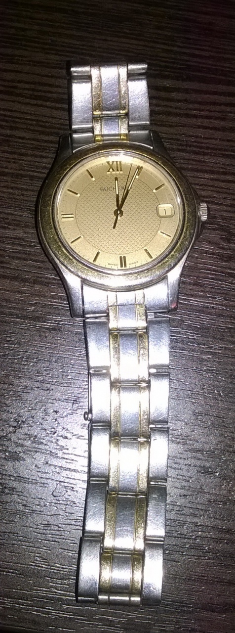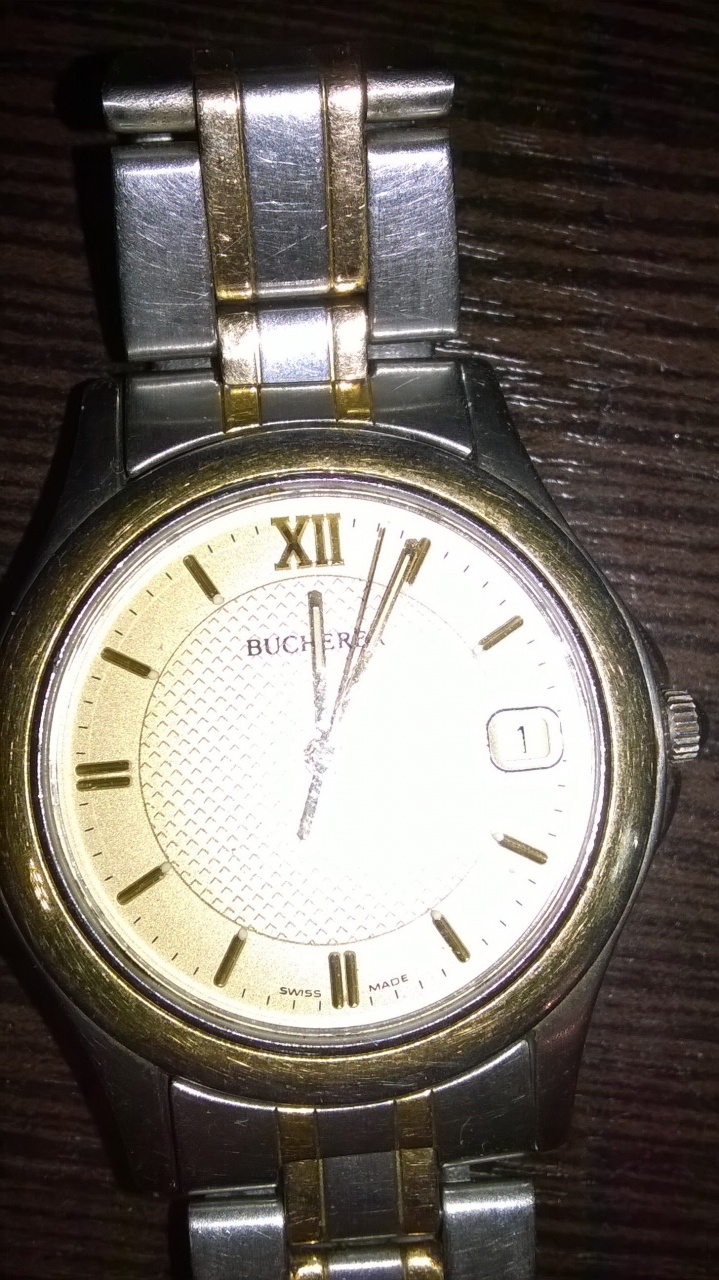 Мужские часы от швейцарской фирмы, сейчас известной как Dr. F. Bucherer. Куплены в Испании в середине 90-х. Сапфировое стекло без царапин. Села батарейка, требуется замена. Сзади на крышке надпись: Stainless Steel Sapphire Crystal Waterresistant Bucherer 955903. Ширина корпуса (без учета колесика) 3,5 см.