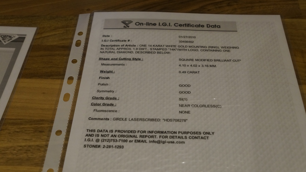 На камне имеется лазерная гравировка с номером сертификата IGI (HDS708278), проверка сертификата возможна онлайн на сайтах IGI и GemEx.