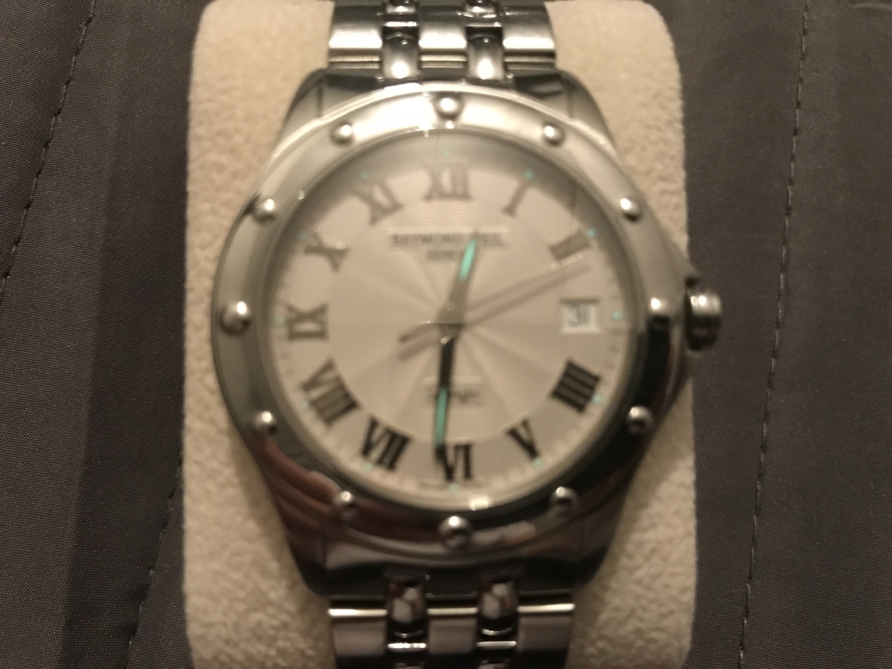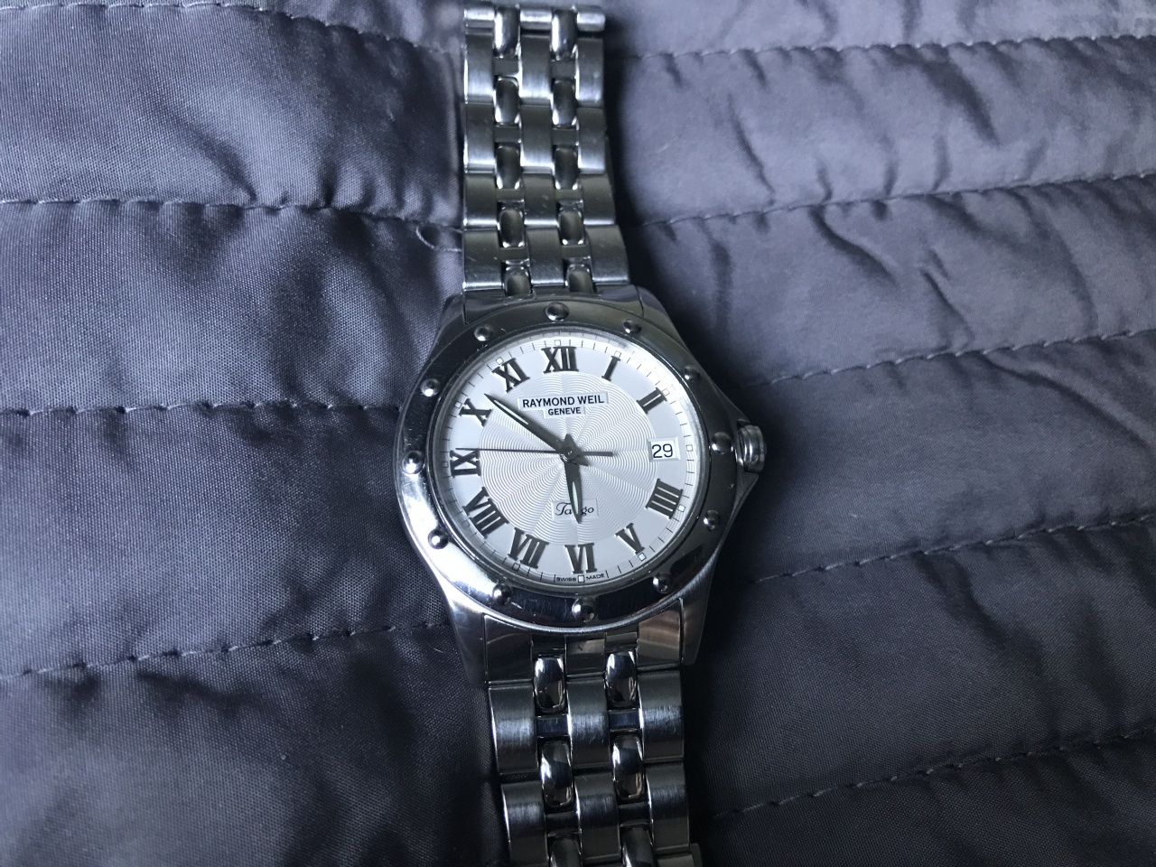 Raymond Weil Tango-5590 на кварцевом механизме ETA 955.112. По корпусу и браслету имеются следы эксплуатации, по моему мнению не значительные. Стекло сапфировое. Интересен обмен прежде всего на швейцарские кварцевые часы, но возможно и другие варианты заинтересуют, жду любых предложений. Пересылать возможности нет, по этому обмен только при личной встрече в Москве. Браслет отрегулирован на запястье примерно 18 см., есть запасные звенья. Коробки, инструкций, нет. Продажа возможна, но в приоритете обмен.