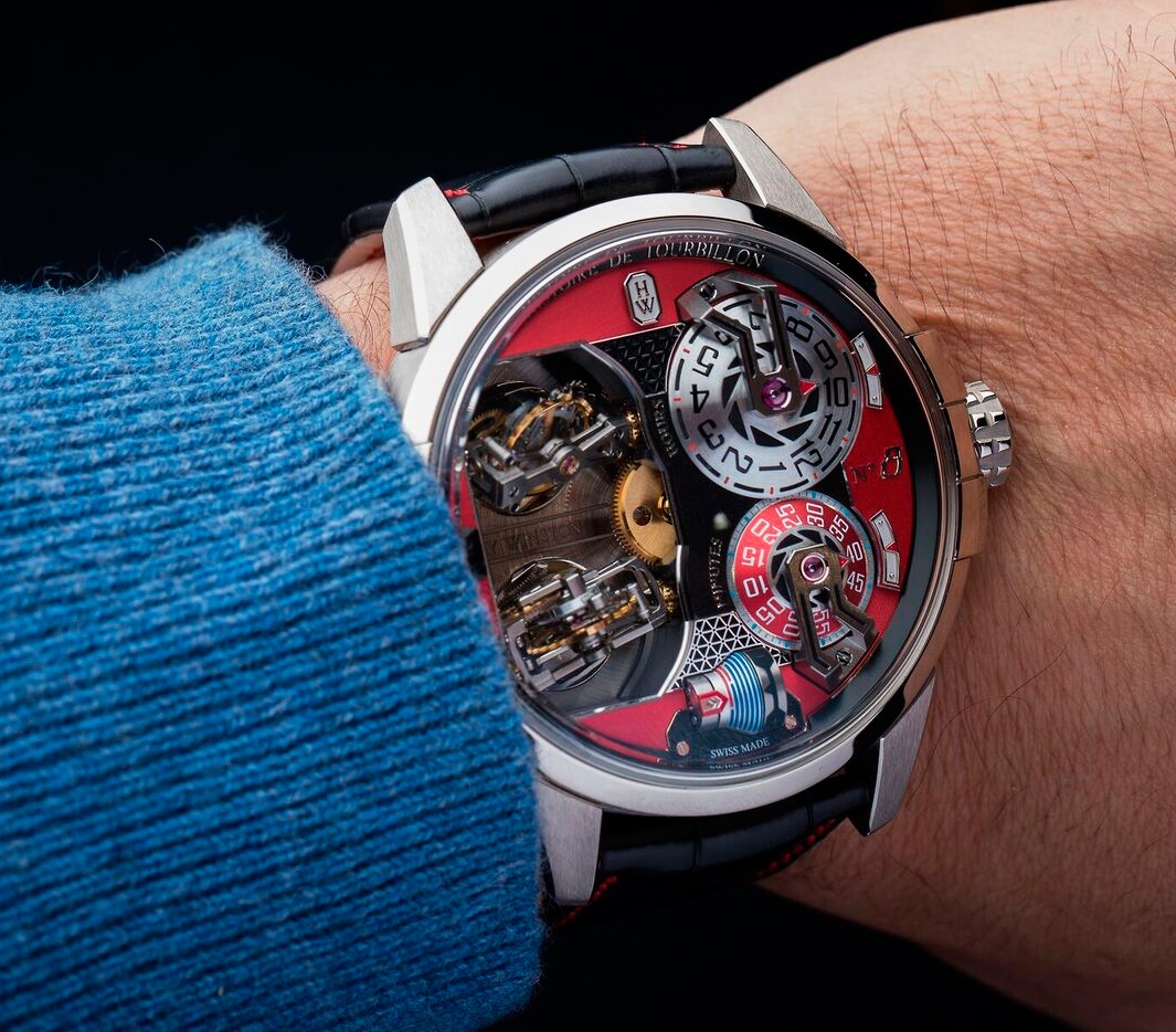Калибр HW4503 – сердце модели Histoire de Tourbillon 8 – практически полностью выполнен из титана. Этот легкий, прочный, немагнитный материал с трудом поддается машинной обработке. Изготовление из него сложнейших деталей, необходимых для калибра HW4503, требует исключительного мастерства. Титан, использованный для сборки плат и мостов, был прежде всего подвергнут пескоструйной обработке или полировке, в зависимости от дальнейшего применения. Края каждой детали были скошены вручную, что потребовало длительного времени и очень высокой квалификации. Титан был также использован для создания трехмерных мостов, на которых размещаются часовые и минутные указатели.