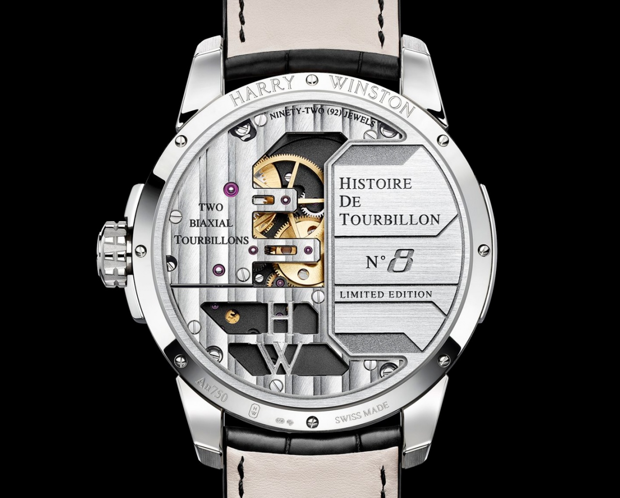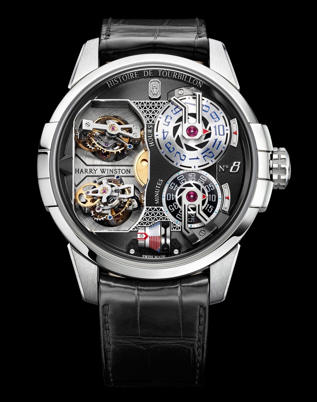 Продолжая осваивать удивительный мир часов с турбийоном, Дом Harry Winston представляет Histoire de Tourbillon 8. Новая модель, оснащенная двумя двухосными турбийонами со сферическим дифференциалом, являет собой вершину часового мастерства и подлинное чудо кинематики. Две большие каретки турбийона, отделанные в лучших традициях Высокого часового искусства, медленно исполняют захватывающе точные балетные фигуры. Турбийоны указывают время на двух сдвинутых от центра счетчиках конусовидной формы, размещенных в импозантном корпусе из белого золота, дизайн которого полностью подчинен этой сложнейшей функции. Эксклюзивный характер часов Histoire de Tourbillon 8 подчеркнут тщательной проработкой деталей, высочайшим качеством отделки и великолепной механикой.