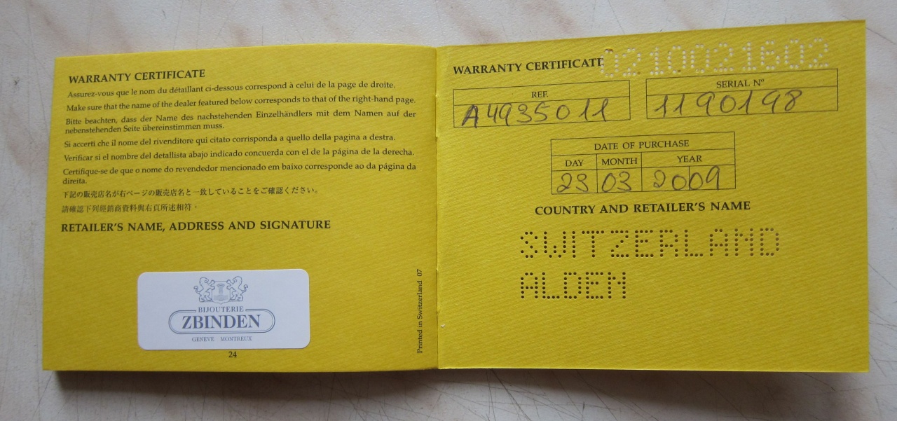 Часы были приобретены в 2009 году в Швейцарии (заказывал друзьям, которые туда ездили). Полная комплектация (подробные фото ниже в теме). Покупались в специализированном магазине.
